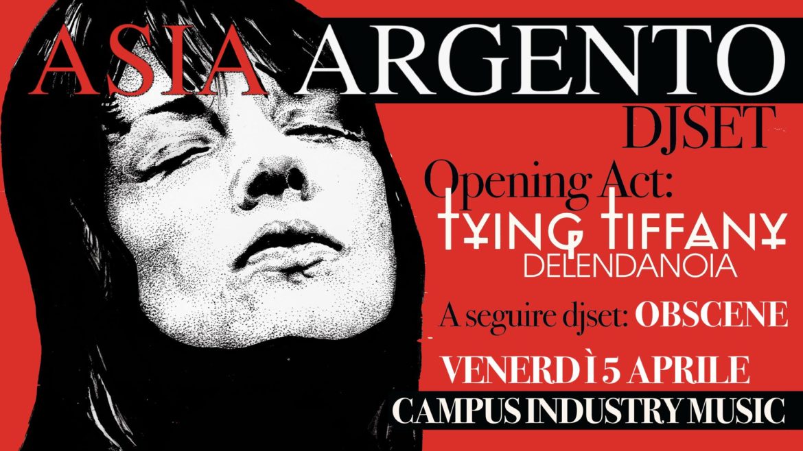 Venerdì 5 Aprile al Campus Industry Music è attesa Asia Argento, con il nuovo progetto di dj set con cui sta riempiendo i migliori club d’Italia. Aftershow con con Obscene dj set e apertura a cura di Tying Tiffany e Delenda Noia, a partire dalle 22:30. Ingresso 18 euro, in lista 16, per informazioni e liste tel. 3314241169.