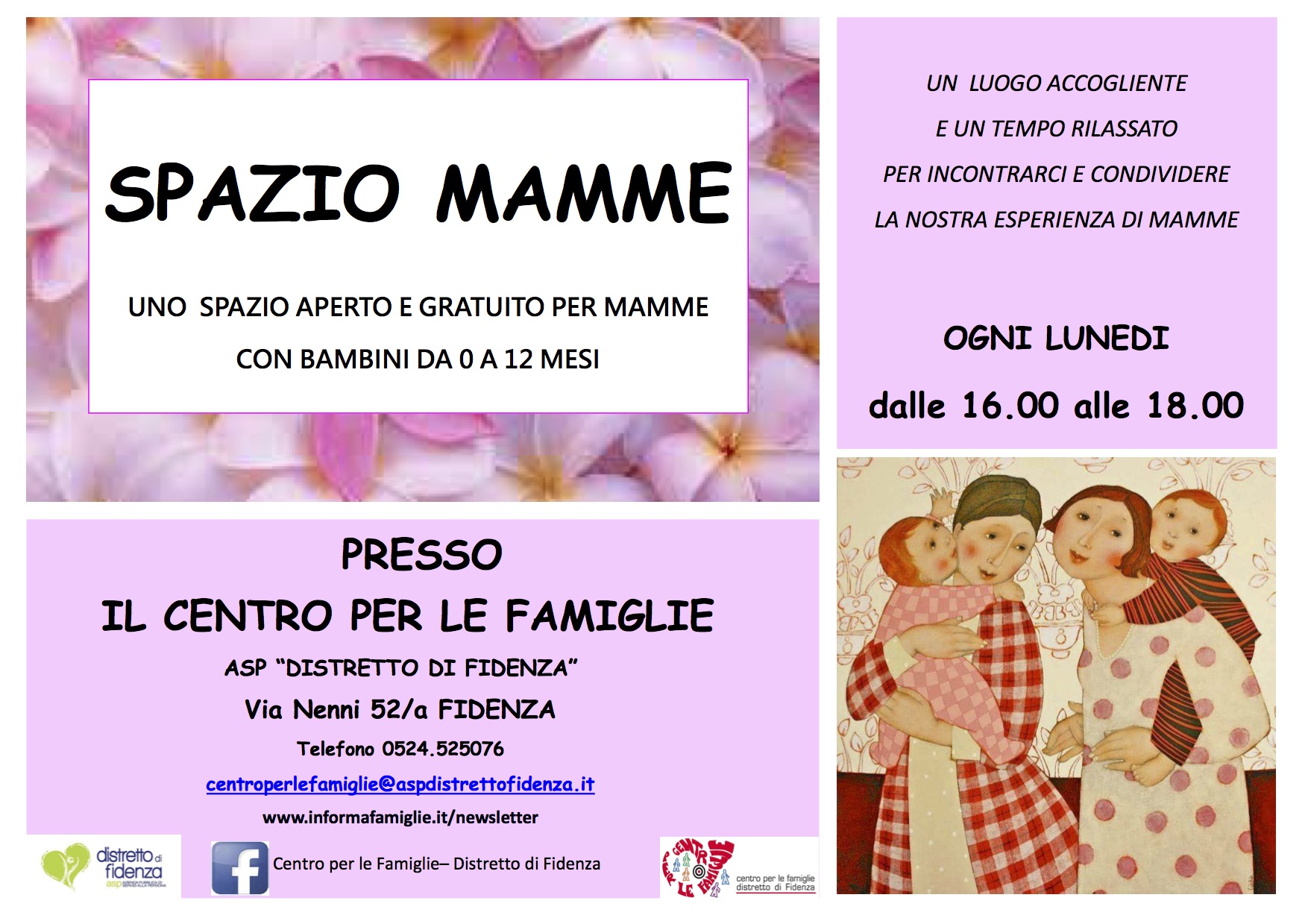 Lo SPAZIO MAMME tutti i lunedì dalle 16.00 alle 18.00 accoglie mamme con bambini da 0 a 12 mesi, in un luogo informale ed accogliente dove ci si incontra e si condivide l’esperienza che si sta vivendo.