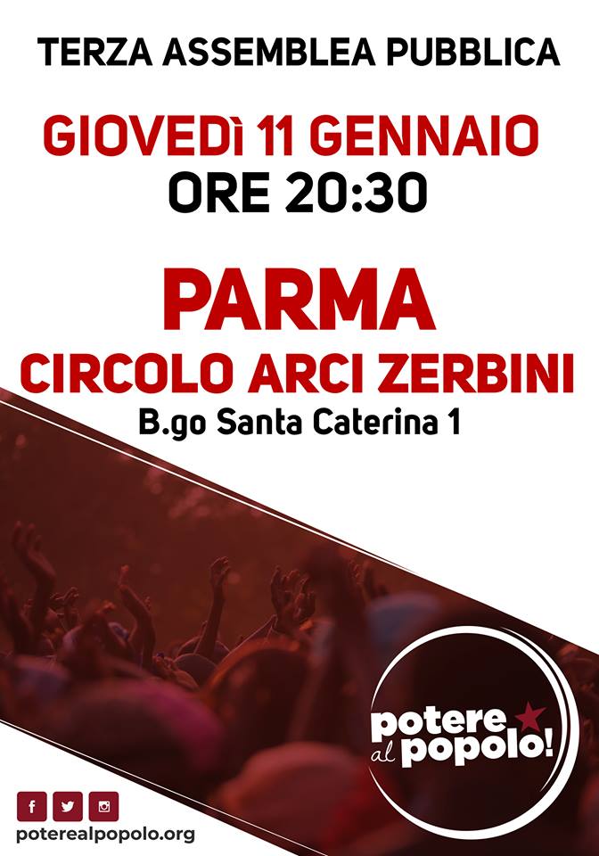 “Potere al Popolo” di Parma convoca un nuovo incontro plenario e pubblico per giovedì 11 gennaio, dalle ore 20,30 alle 22, presso il circolo Arci Zerbini, in borgo santa Caterina 1. per la presentazione delle candidature alle elezioni politiche.