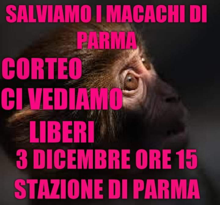 Corteo Ci vediamo liberi, sabato 3 dicembre ore 15, stazione di Parma: la battaglia per salvare i macachi di Parma continua.