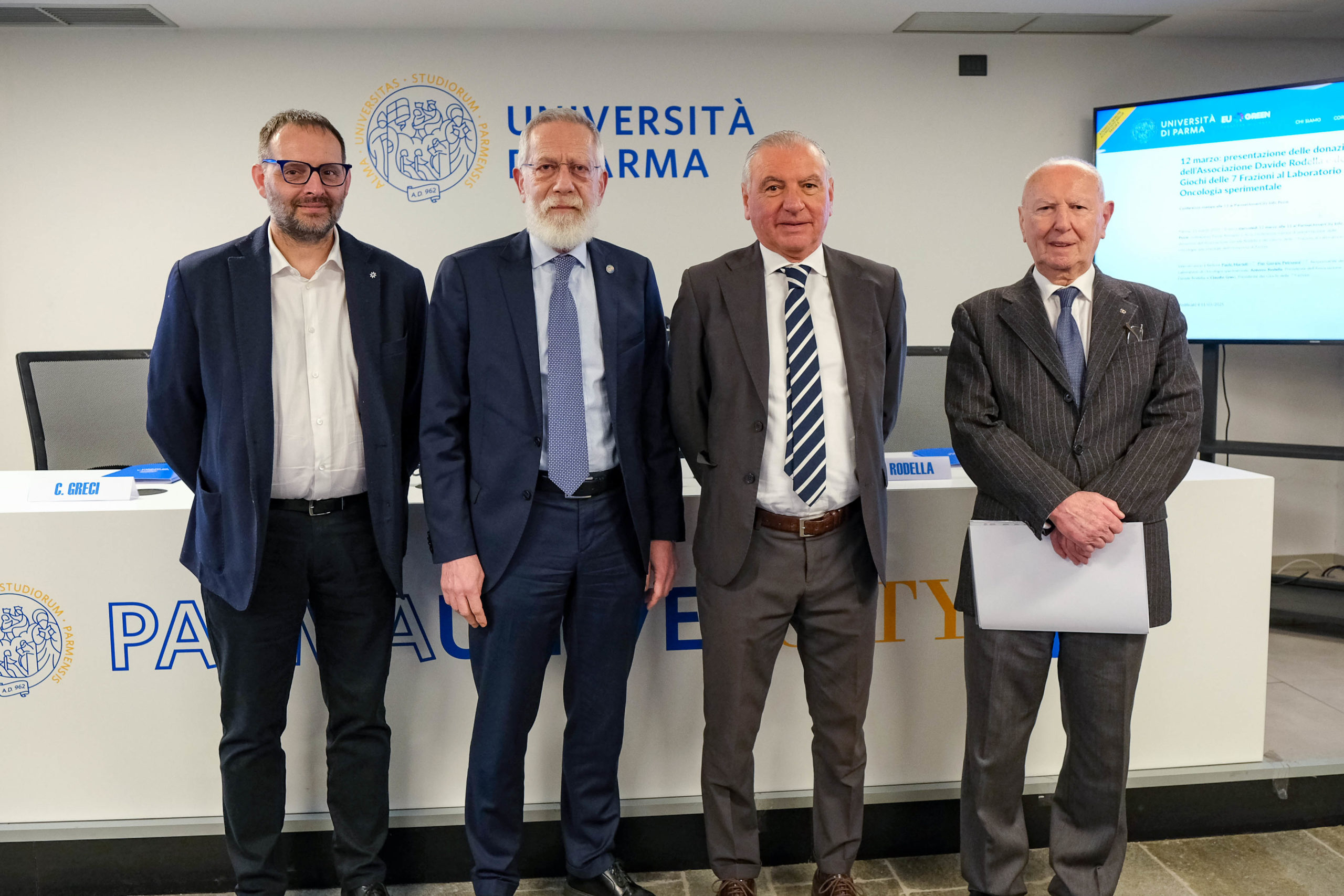 Oggi la presentazione delle donazioni in una conferenza stampa al ParmaUniverCity Info Point, con gli interventi del Rettore Paolo Martelli, di Pier Giorgio Petronini, docente di Patologia generale e responsabile del Laboratorio di Oncologia sperimentale del Dipartimento di Medicina e Chirurgia, di Antonio Rodella, Presidente dell’Associazione Davide Rodella, e di Claudio Greci, Presidente dei Giochi delle 7 Frazioni.