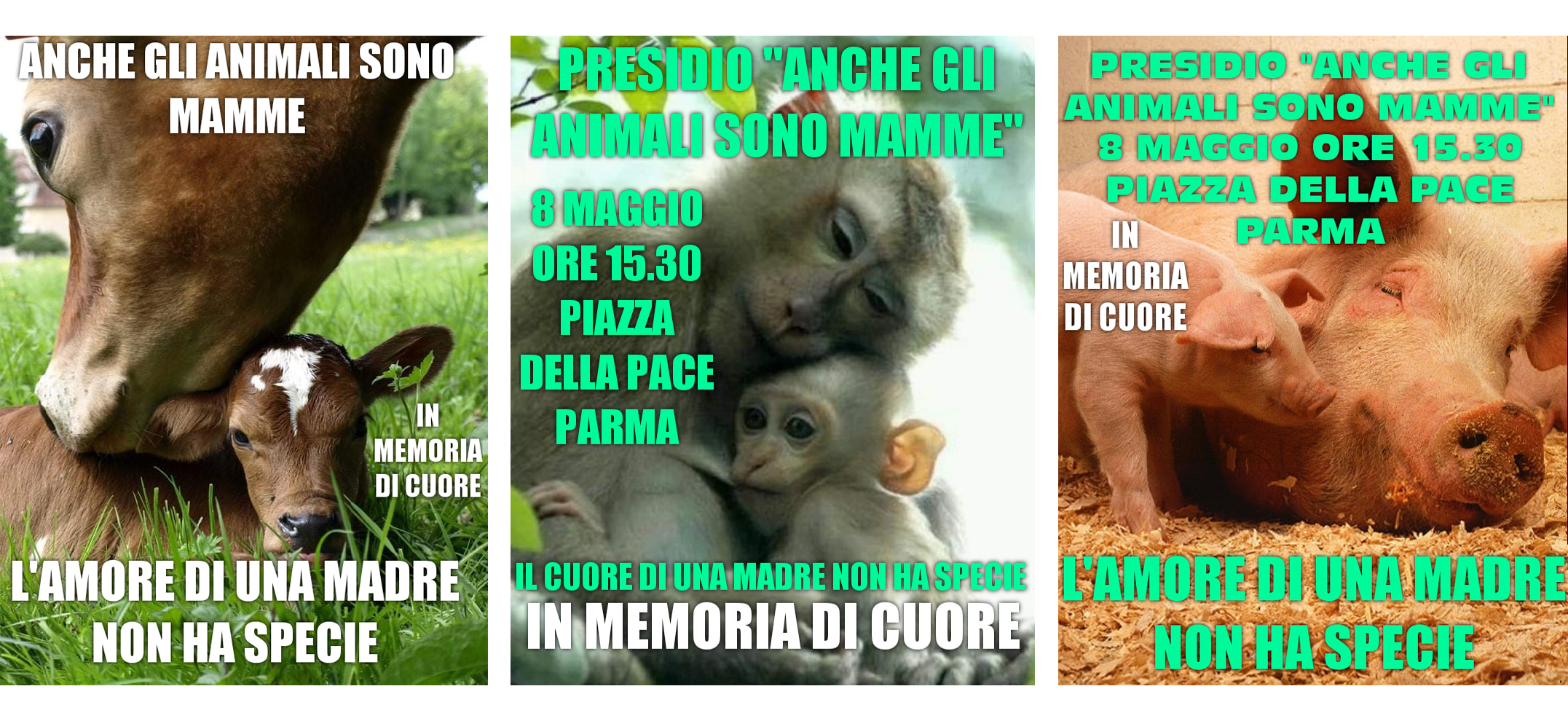 L’evento, dal titolo “Anche gli animali sono mamme”, si terrà domenica 8 maggio alle 15.30 in Piazza della Pace a Parma. “Abbiamo deciso di organizzare questo presidio antispecista per la festa della mamma, per tutti i cuccioli e le loro mamme animali, esseri senzienti sfruttati, imprigionati e uccisi”, dicono le associazioni in un comunicato.