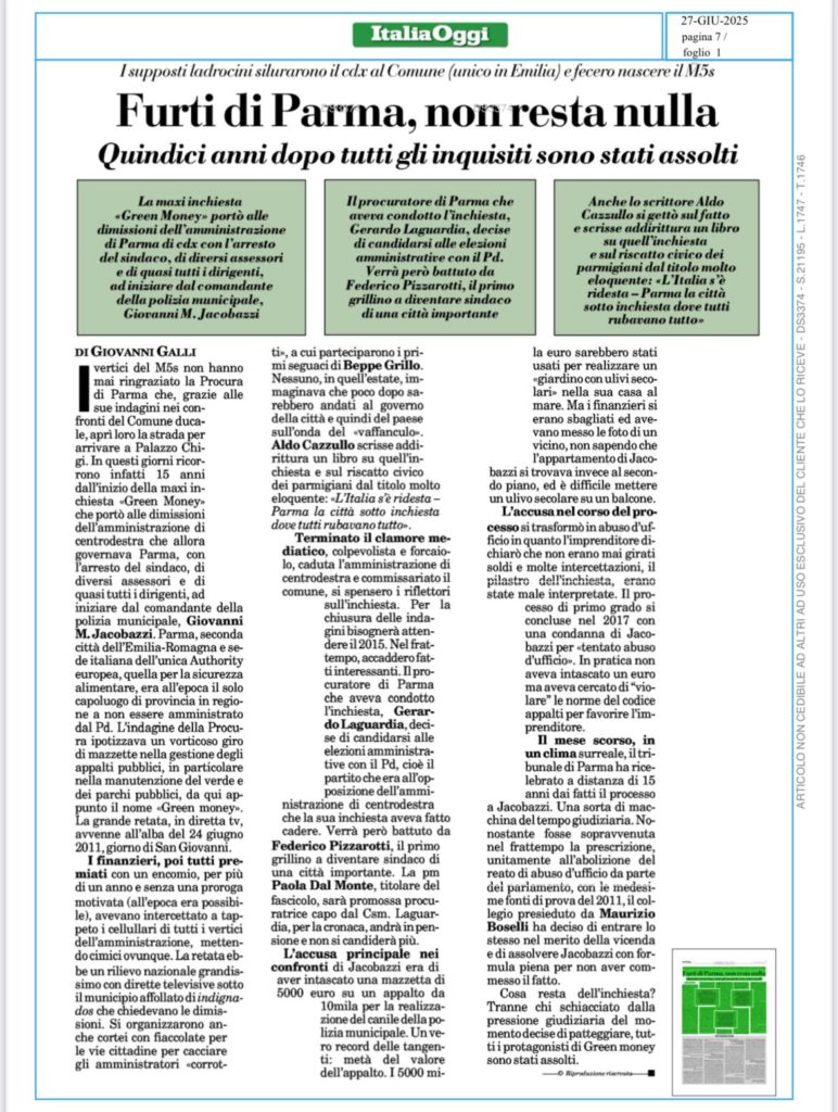 Quella di Jacobazzi è l’ennesima assoluzione di un imputato che hanno deciso di accettare il processo a seguito delle varie indagini che hanno riguardato il Comune di Parma (“Green Money 1”, “Green Money 2” “Public Money”, “Spot Money”, “Easy Money”, Scalo Merci, Ex Macello, Ospedale Vecchio, Spip, nomine dirigenti, etc.).