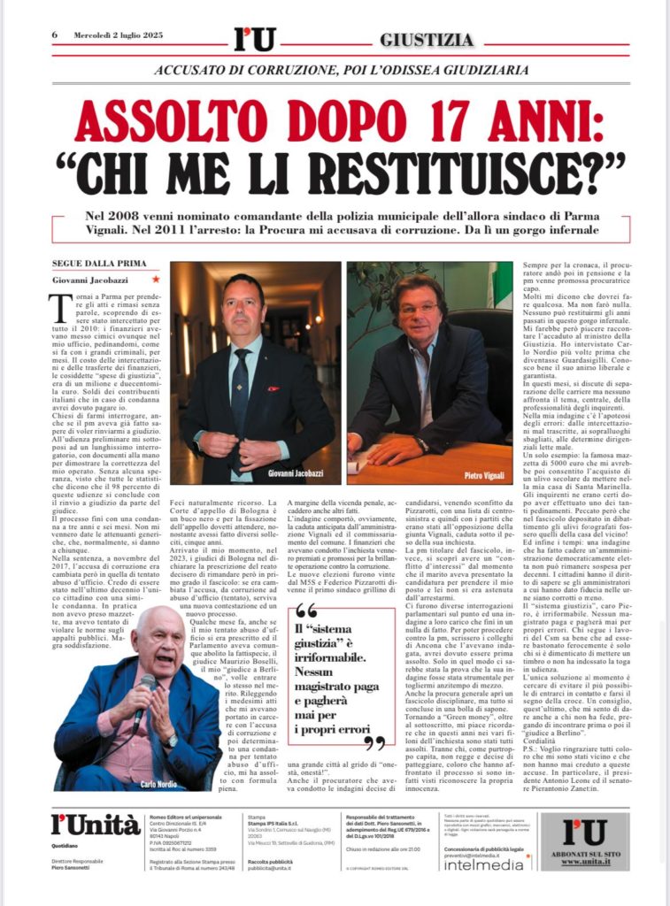 Dell’assoluzione di Giovanni Jacobazzi scrive anche il giornale L’Unità.