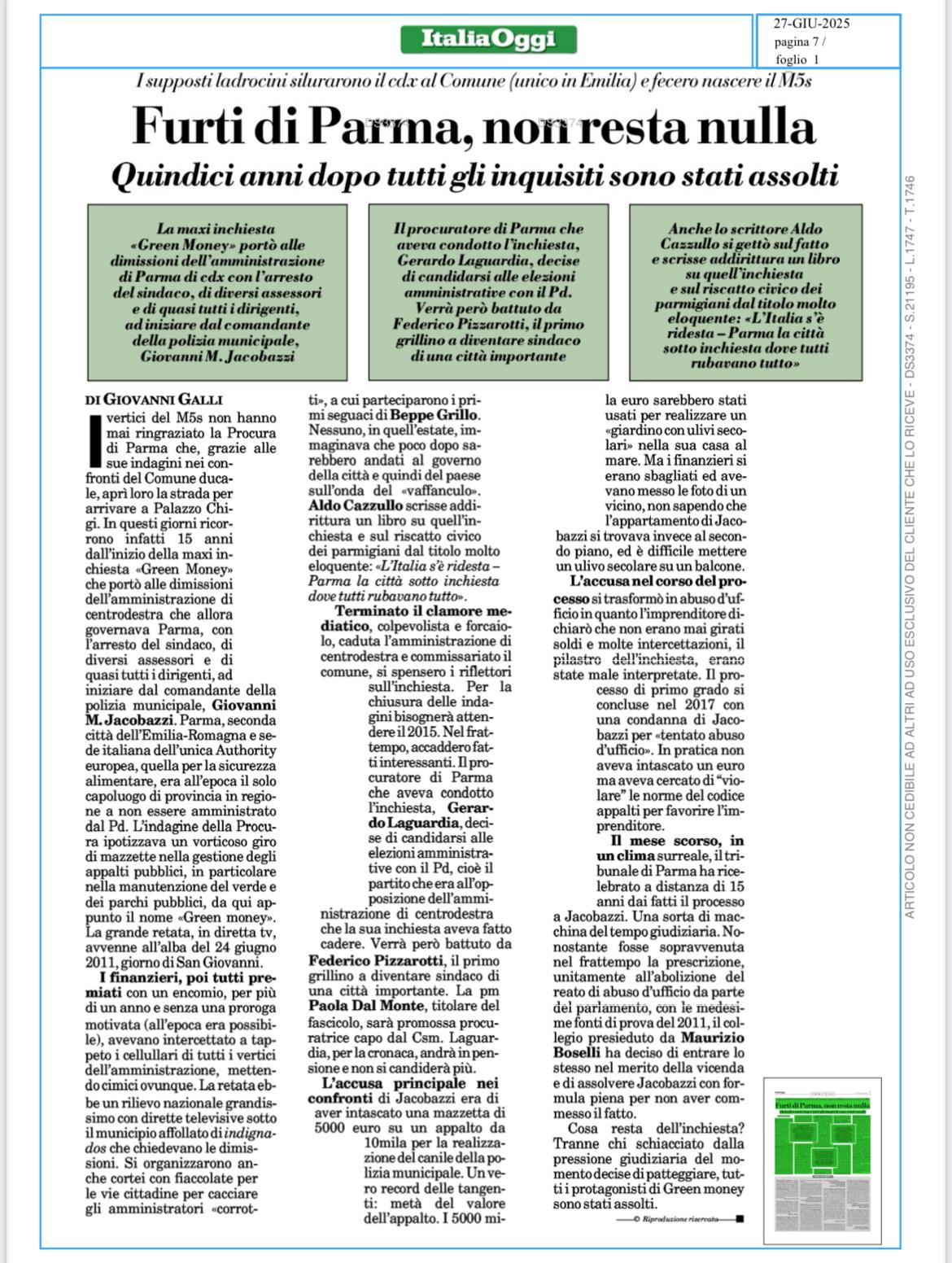 Quella di Jacobazzi è l’ennesima assoluzione di un imputato che hanno deciso di accettare il processo a seguito delle varie indagini che hanno riguardato il Comune di Parma (“Green Money 1”, “Green Money 2” “Public Money”, “Spot Money”, “Easy Money”, Scalo Merci, Ex Macello, Ospedale Vecchio, Spip, nomine dirigenti, etc.).