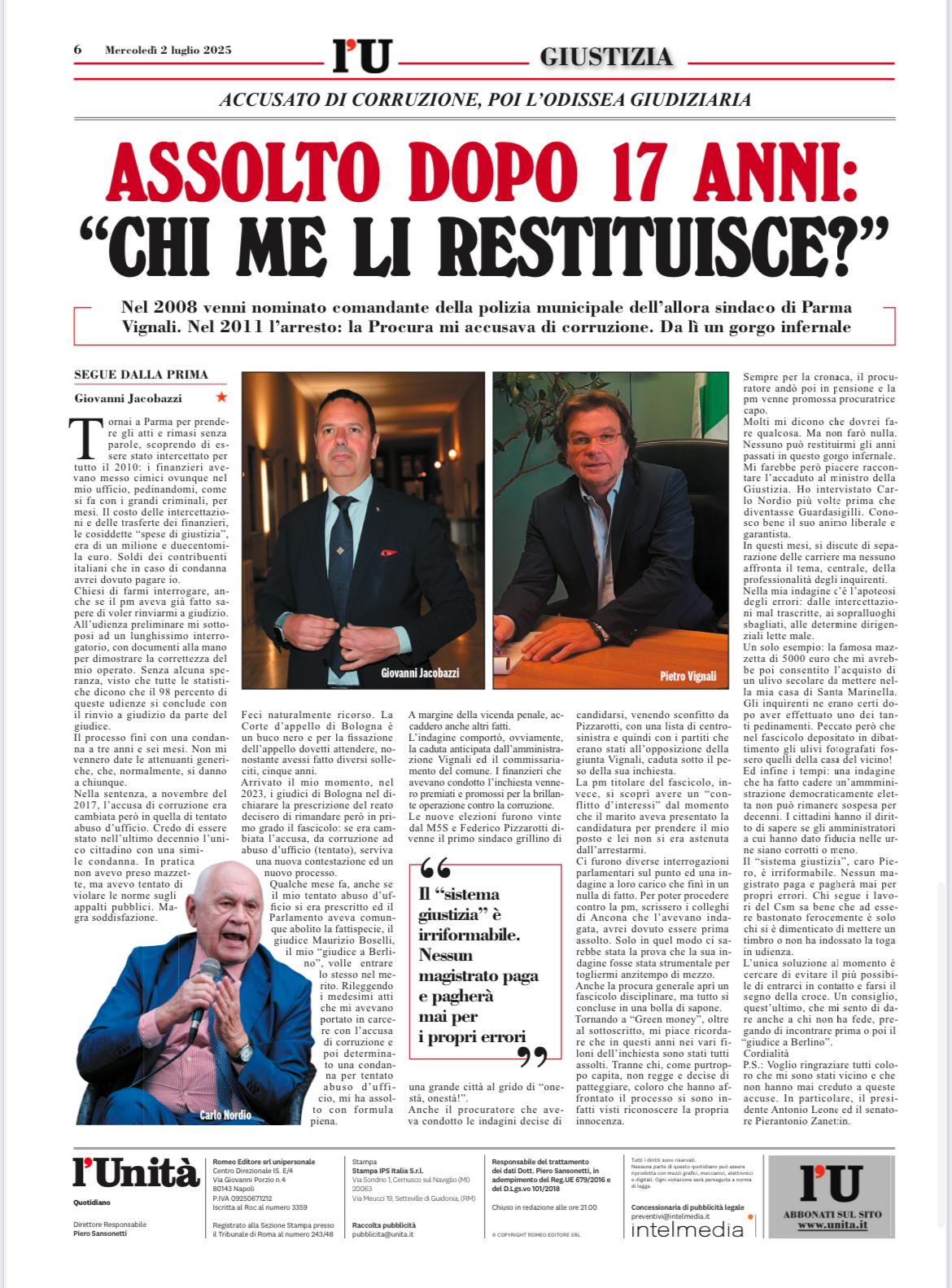 Dell’assoluzione di Giovanni Jacobazzi scrive anche il giornale L’Unità.
