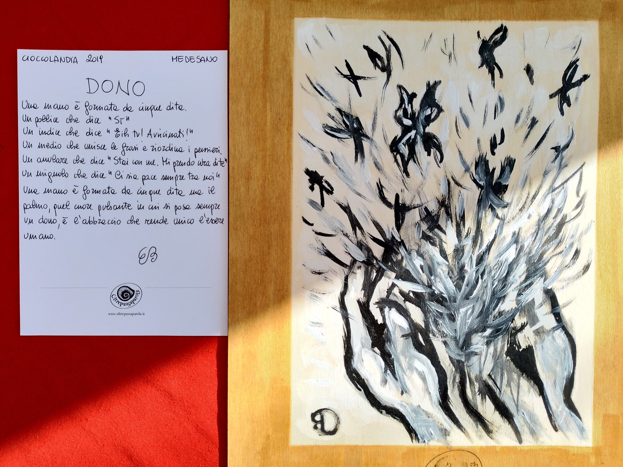 Oltrepassaparola è una particolarissima performance di scrittura e pittura dal vivo per uno spettatore alla volta. Partendo da una parola scelta dallo spettatore, davanti ai suoi occhi la scrittrice Elisa Bertuccioli la trasforma in un racconto breve, e la pittrice Daniela Panfilo in un dipinto.