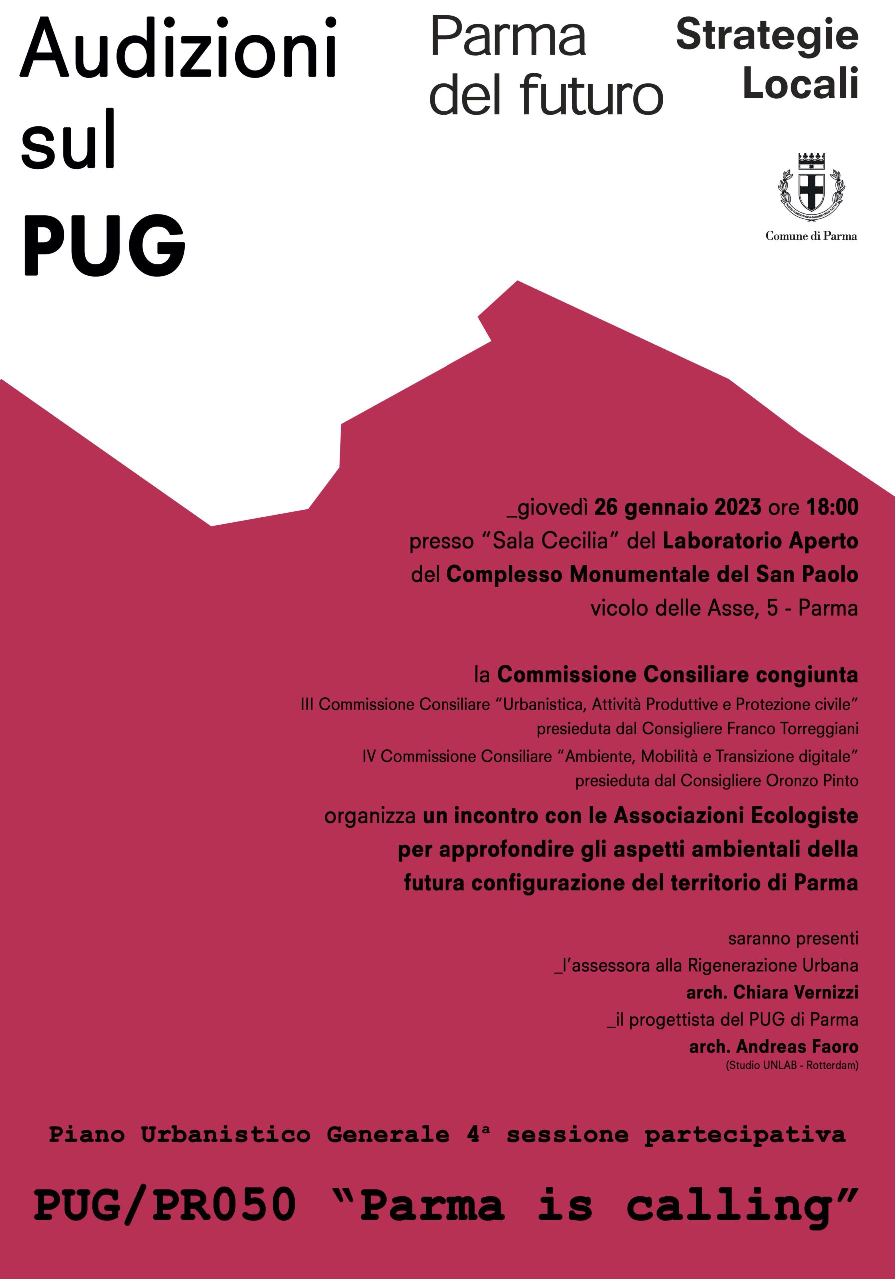Martedì 24 alle ore 18 e giovedì 26 alle ore 18 e 21 si terranno tre incontri di audizione sul PUG del Comune di Parma sui temi delle esigenze urbanistiche della sanità e del Welfare, degli aspetti ambientali della futura configurazione del territorio di Parma e sulle future esigenze abitative della città.