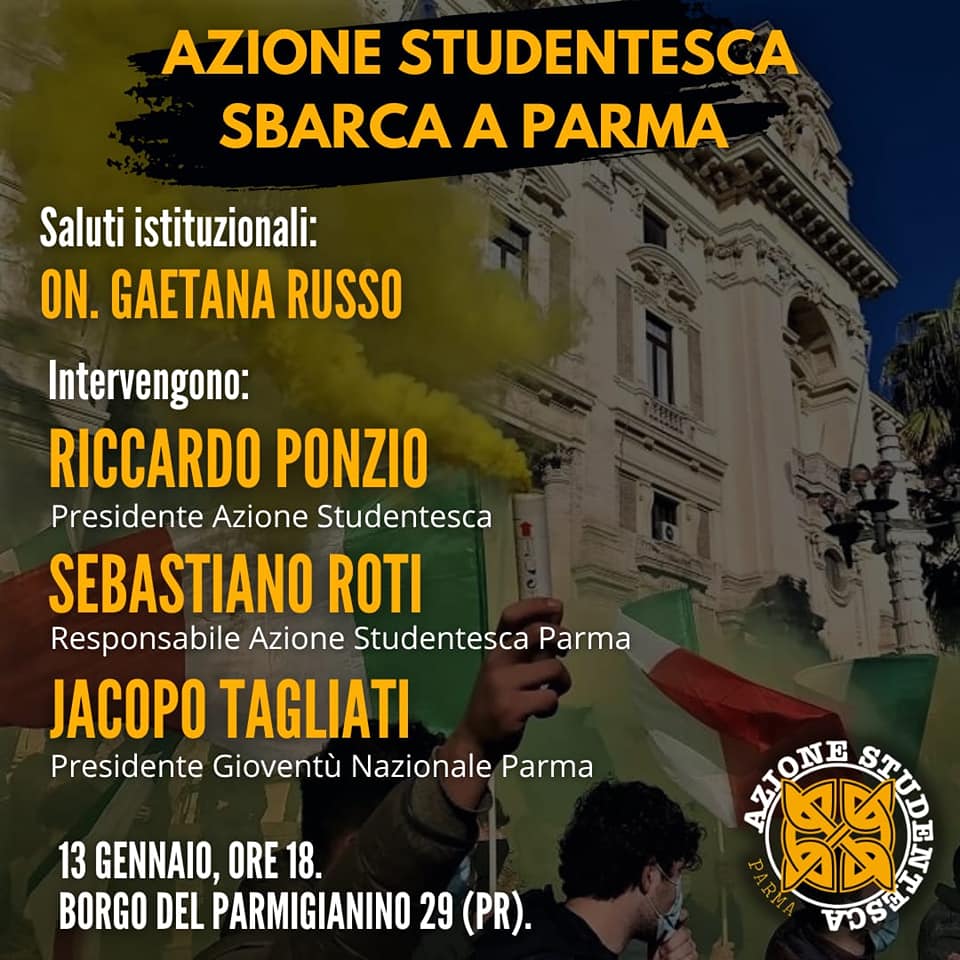 La presentazione di Azione Studentesca Parma, movimento studentesco di Fratelli d’Italia, si terrà il 13 Gennaio p.v. alle ore 18.00, in borgo del Parmigianino 29, sede cittadina di FdI.