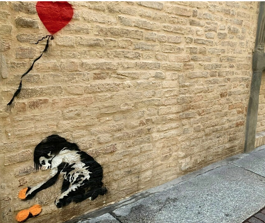 C’è, come sempre nelle opere dell’artista, ironia, gioco, il piacere di nascondersi e di ap-parire all’improvviso inaspettato critico di una situazione, di una realtà, sfuggente insieme e pronto a sottrarsi per dire che lui non è nella mostra che gli è stata dedicata ‘là sotto’ catacombale. Lui è al-trove. Fa riferimento alla commercializzazione dell’opera dell’artista e le palle non possono sostituire il palloncino sfuggito per sempre, metafora appunto di libertà. Questa immagine, se non autentica di Banksy, dimostra che l’autore pensa come lui. L’iconografia è totalmente di Banksy giocata su una sintesi visiva chiaramente leggibile e comunicabile con una semplice battuta in un’immagine insieme poetica, ironica e di estrema sintesi visiva. L’uso dello stencil rende difficile riconoscere quella che gli antichi artisti chiamavano ‘la mano’, ma insieme nulla, almeno per i dati che abbiamo, la nega poiché qui c’è tutto lo spirito di Banksy”.