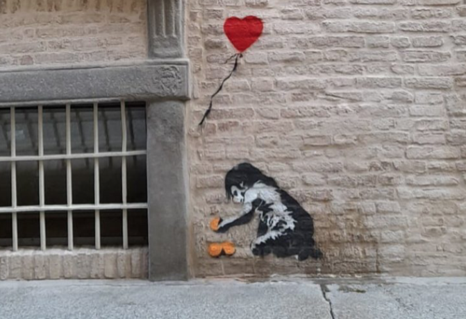 Sul lato sud di Palazzo Tarasconi, la splendida scenografica sede della mostra in corso fino al 16 gennaio prossimo di “Banksy. Building Castles in the Sky”, è apparsa una sorprendente figura acco-vacciata a cui sfugge un palloncino vivacemente rosso, a lato di una delle finestre manieristiche che danno luce alla cantina luogo della esposizione in corso. La grata spessa e intrecciata dà il senso del-la chiusura, della prigionia, in cui le opere dell’artista di Bristol sono conservate. Questo lato sud è quello che permette di operare con la maggior tranquillità, nel segreto illegale della notte che marchia una parete storica e monumentale, ma la figura vi si inserisce, come altre note dell’artista, con legge-ra lievità. Nel fronte dell’edificio non si legge alcun segno che indichi la presenza di un sotterraneo, per cui qui doveva essere il possibile ed eventuale giudizio dell’artista sulla mostra in corso.
