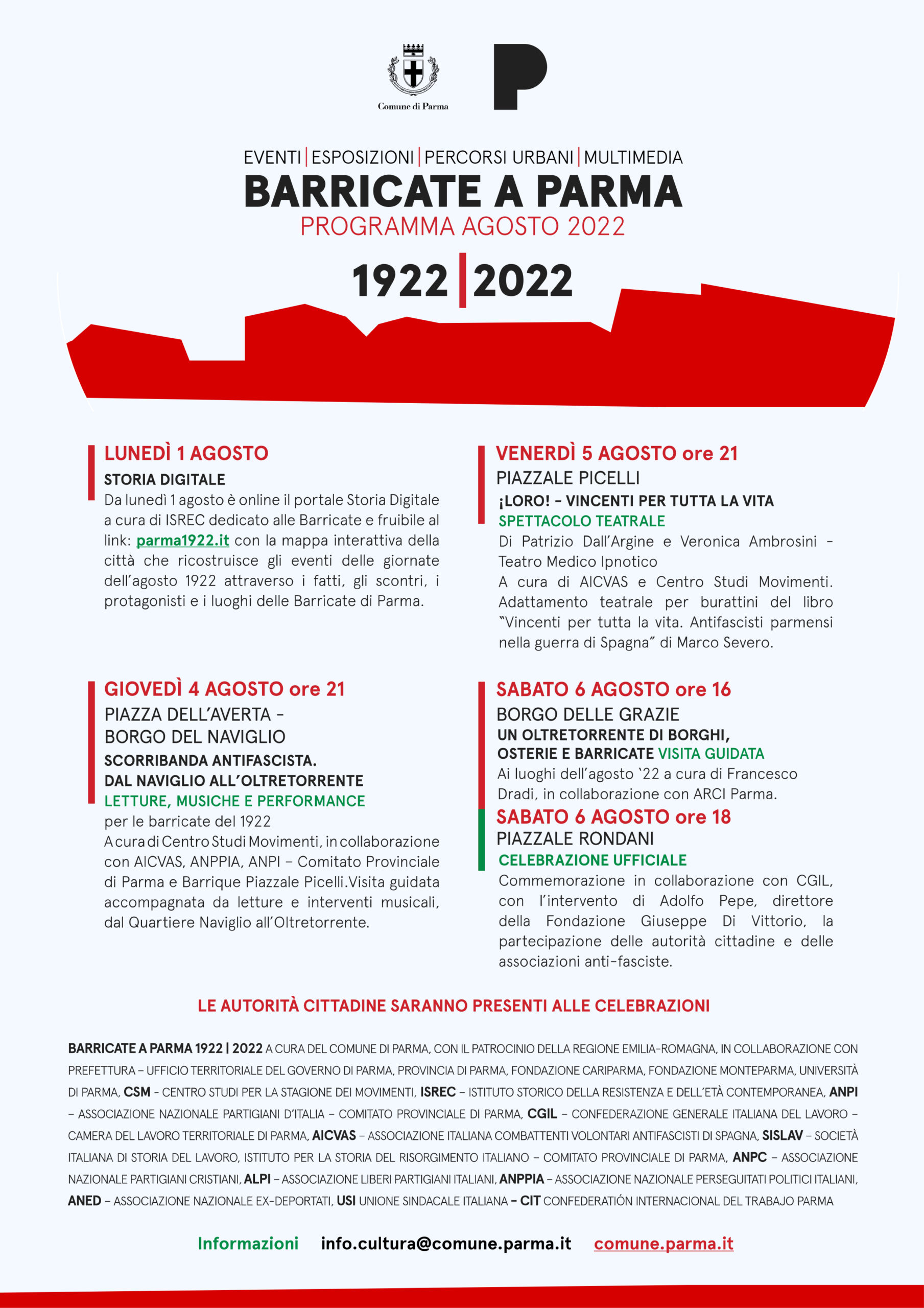 Le celebrazioni del Centenario delle Barricate a Parma, coordinate dal Comune di Parma con il patrocinio della Regione Emilia-Romagna e il coinvolgimento di numerosi soggetti e istituzioni del territorio, entrano nel vivo con una serie di iniziative in programma nella prima settimana di agosto nei borghi e nelle piazze simbolo della resistenza popolare all’assedio delle squadre fasciste, avvenuto nei primi giorni dell’agosto del 1922, tra cui spettacoli teatrali, letture e visite guidate che culmineranno con la celebrazione ufficiale di sabato 6 agosto 2022.
