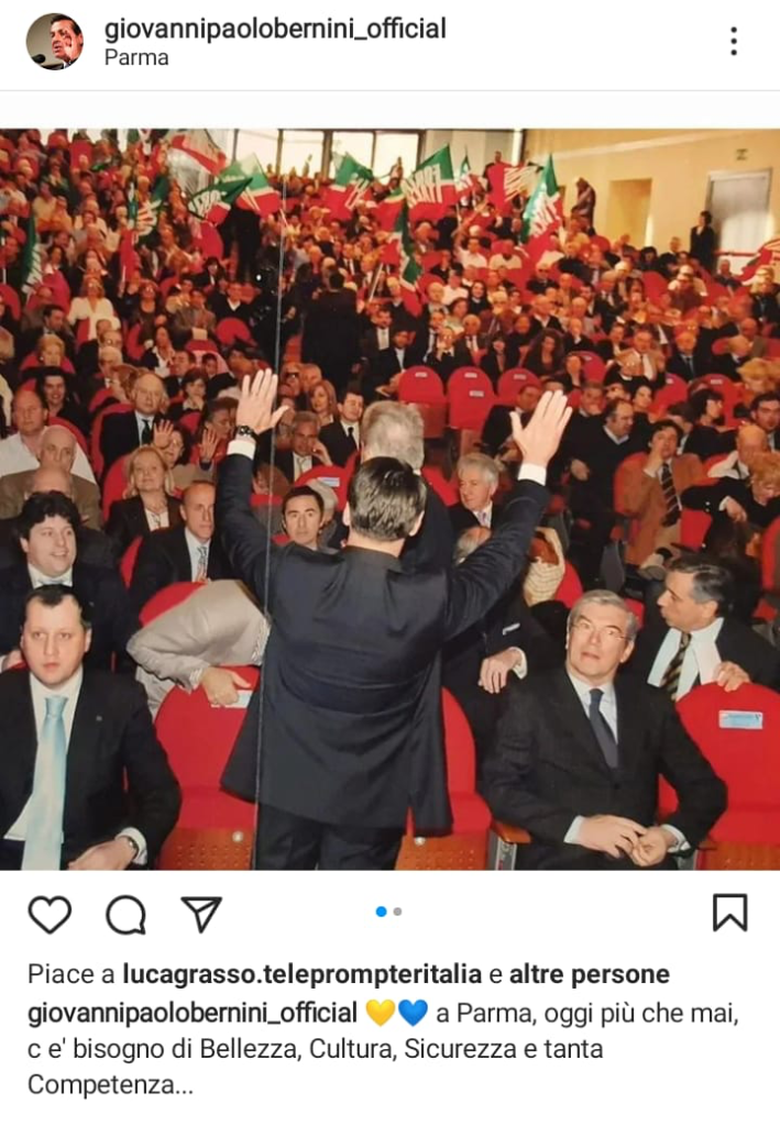 Giovanni Paolo Bernini, uomo forte, fortissimo, di Forza Italia di Parma ha pubblicato oggi sul suo profilo Instagram una foto con lui (di spalle) e Lunardi.