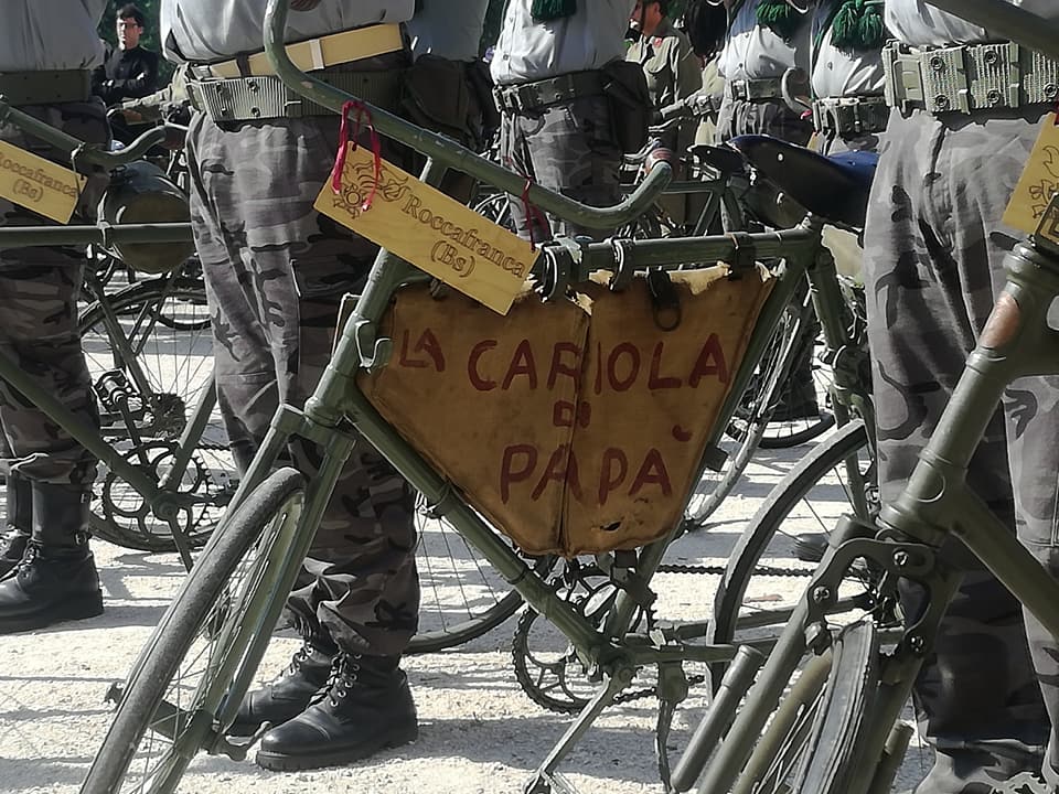 Parma, città Medaglia d’oro al Valor Militare ha ricordato con una sfilata al passo, in bicicletta e in musica fino al cuore della sua Piazza, la specialità del corpo nata nel 1989 dalla matita del Capitano Luigi Camillo Natali. Le carriole, le biciclette a gomme piene e scatto fisso ripiegabile in due pezzi e munita di spallacci per issarla sulle spalle che andarono ad esaltare l’arma specifica dei Bersaglieri: il movimento. Dopo le Guerre Mondiali tutti i Reggimenti Bersaglieri si trasformarono in ciclisti adottando le “carriole”.