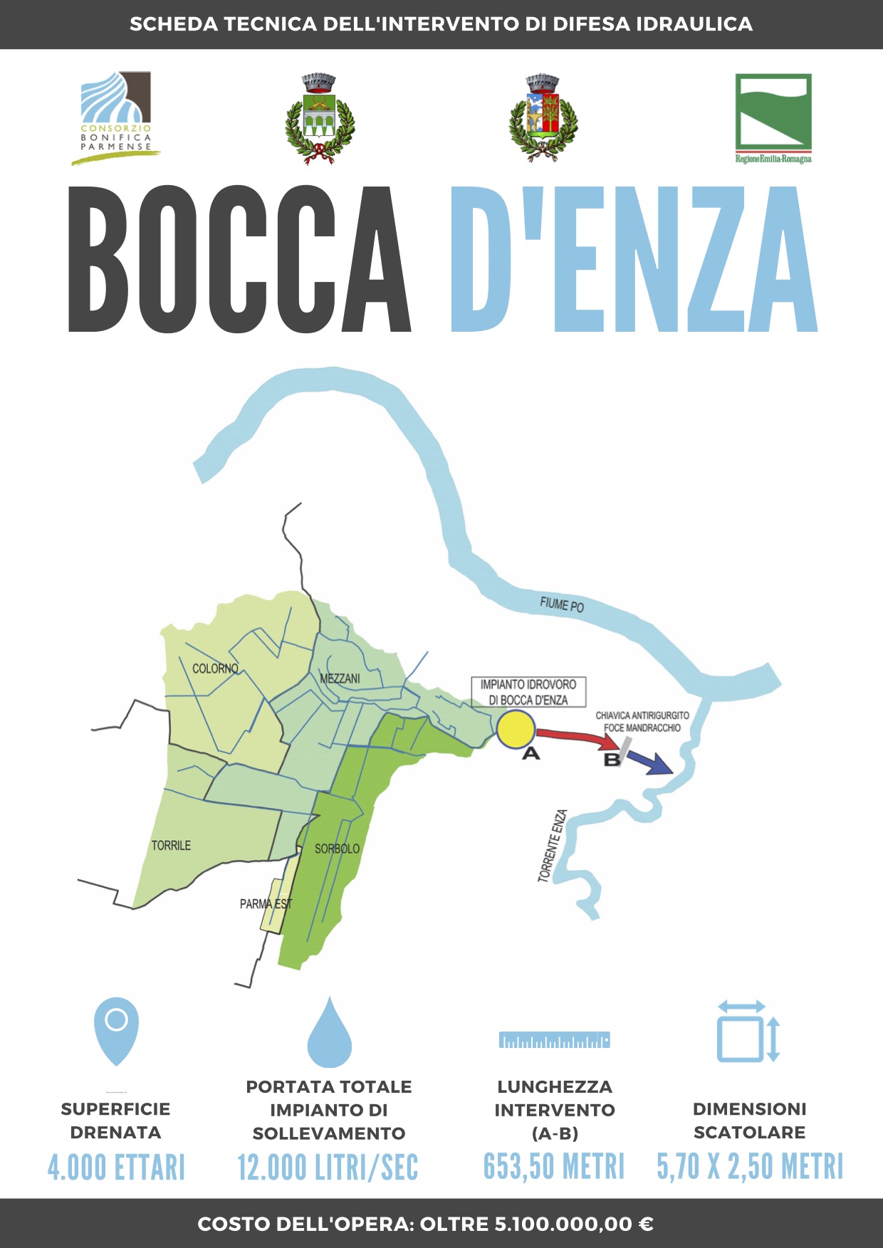 Progetto che ha già superato tutto l’iter procedurale delle verifiche urbanistiche, ambientali ed archeologiche preventive, l’autorizzazione paesaggistica ambientale e quant’altro riguardante la sicurezza del cantiere. Ora la Regione Emilia Romagna l’ha indicato come progetto prioritario e immediatamente cantierabile. L’impianto attuale infatti, costruito all’inizio del secolo scorso, ha immediata necessità di un adeguato ampliamento per offrire maggiori garanzie alla cittadinanza per scongiurare il rischio di esondazioni a causa di grave piena: in caso di precipitazioni consistenti infatti i rigurgiti di acqua dal Po e dall’Enza impediscono all’attuale struttura di scolare le portate correttamente con rischio tangibile di conseguente allagamento delle aree circostanti su cui insistono abitazioni, opifici industriali, aziende agricole, terre coltivate. La modifica ideata assicurerà lo smaltimento delle acque eccedenti in qualsiasi condizione di criticità.
