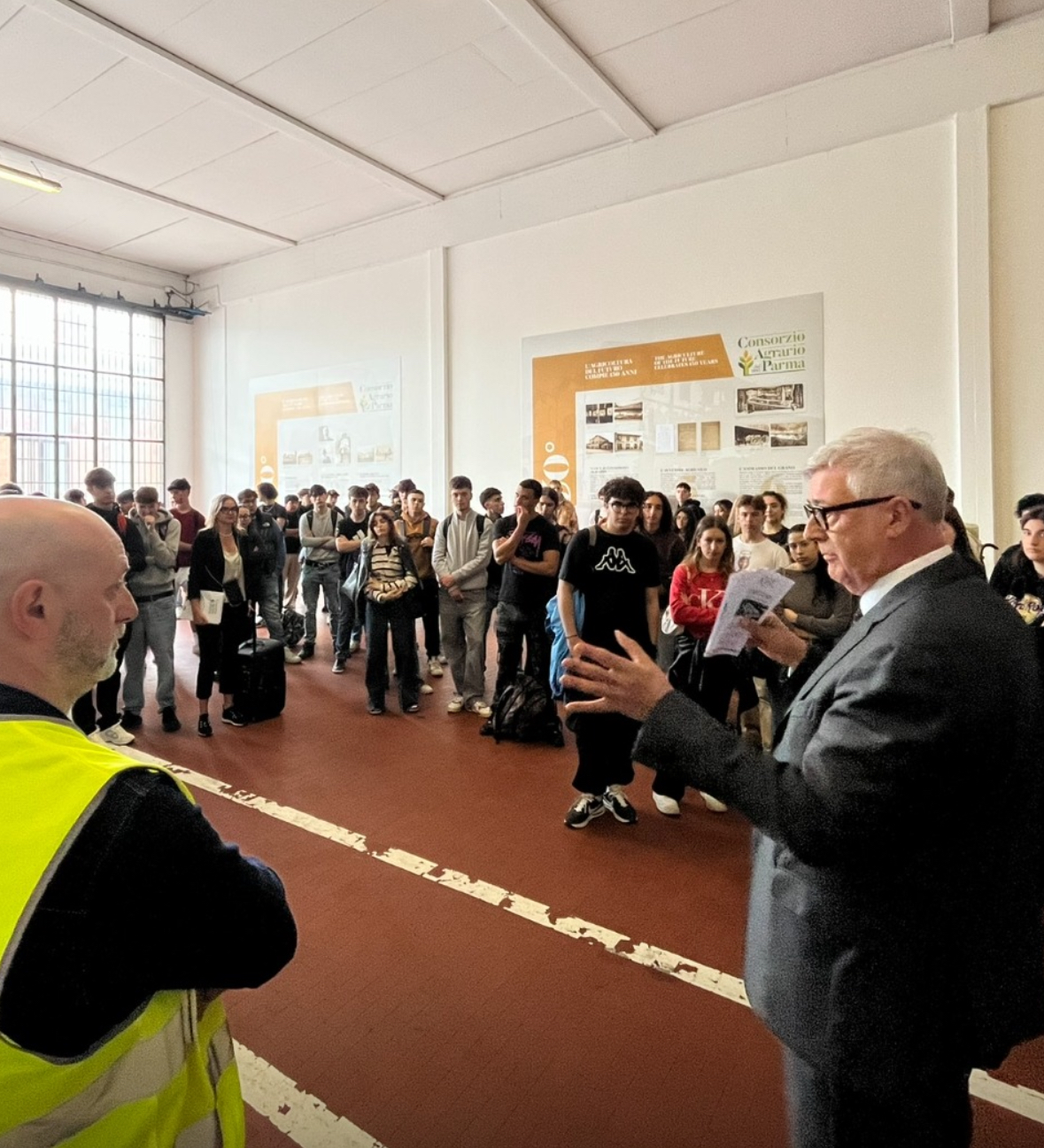 Il direttore generale del Cap Roberto Maddè ha accolto la nutrita delegazione di studenti accompagnati dai loro docenti, illustrando, nel dettaglio, le molteplici attività operative consortili in un variegato percorso aziendale guidato. La storia di oltre 130 anni, le tecniche agronomiche, le macchine agricole, la produzione mangimistica e un focus sul Parmigiano Reggiano, di cui il Consorzio conserva più di 140mila forme nei suoi magazzini generali di stagionatura.