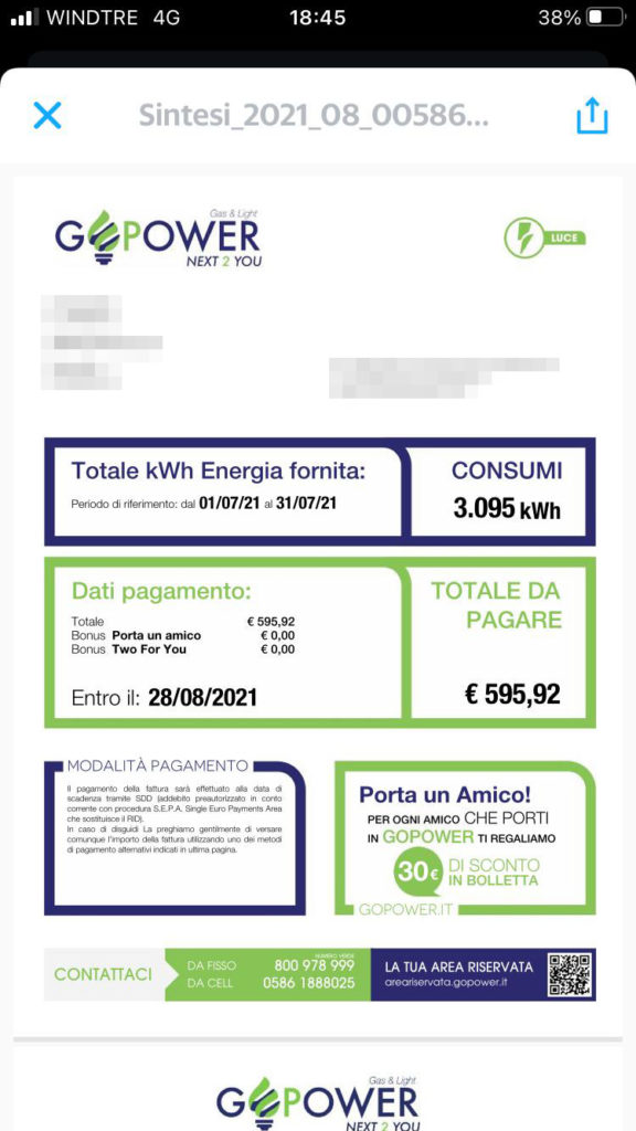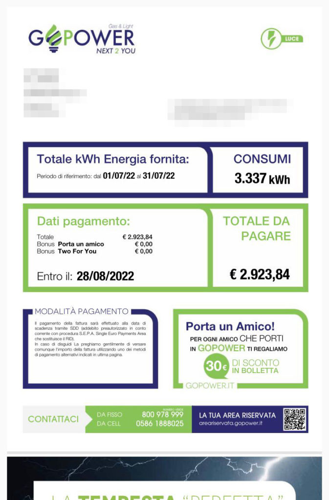 Bollette alla mano: 595 euro a luglio 2021, 2.923 euro a luglio 2022: non si tratta di un’impresa che ha realizzato un ampliamento, ma dello stesso identico bar con consumi energetici simili 3.095 Kwh contro 3.337. Non sono dunque i maggiori consumi a determinare l’aumento di quasi il 500% in un anno.