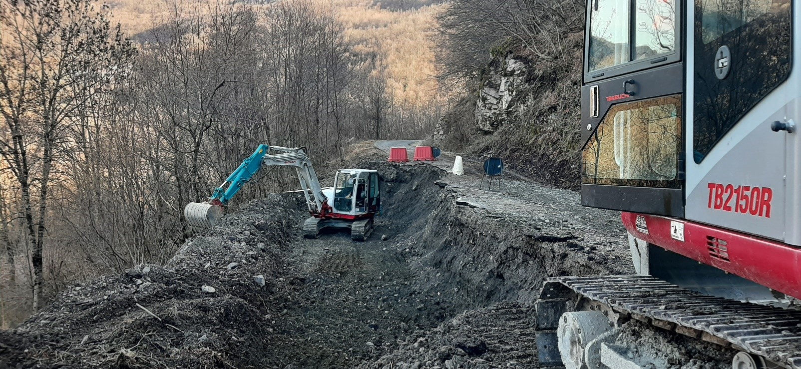 Nella fotografia, un escavatore consortile a lavoro in montagna, sulla strada “Santa Giustina-Roncole, nel Comune di Bardi.