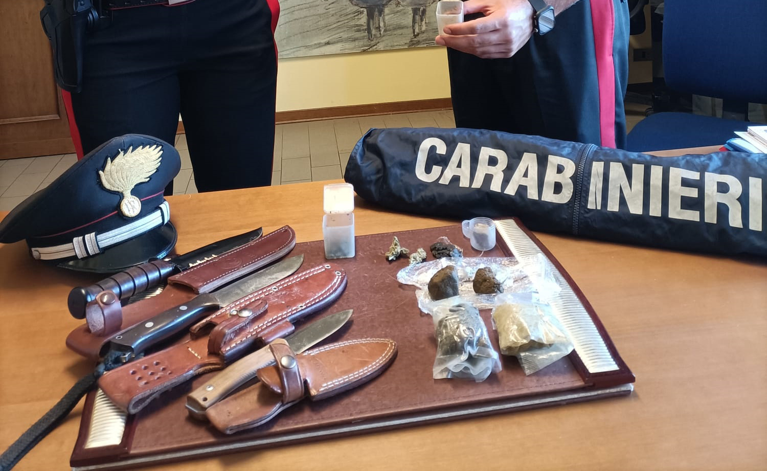 La successiva perquisizione veicolare ha permesso ai militari di rinvenire all’interno di un vano ricavato nel portabagagli tre panetti di hashish per un peso complessivo di oltre un etto. Lo stupefacente e le armi bianche sono state sequestrate.