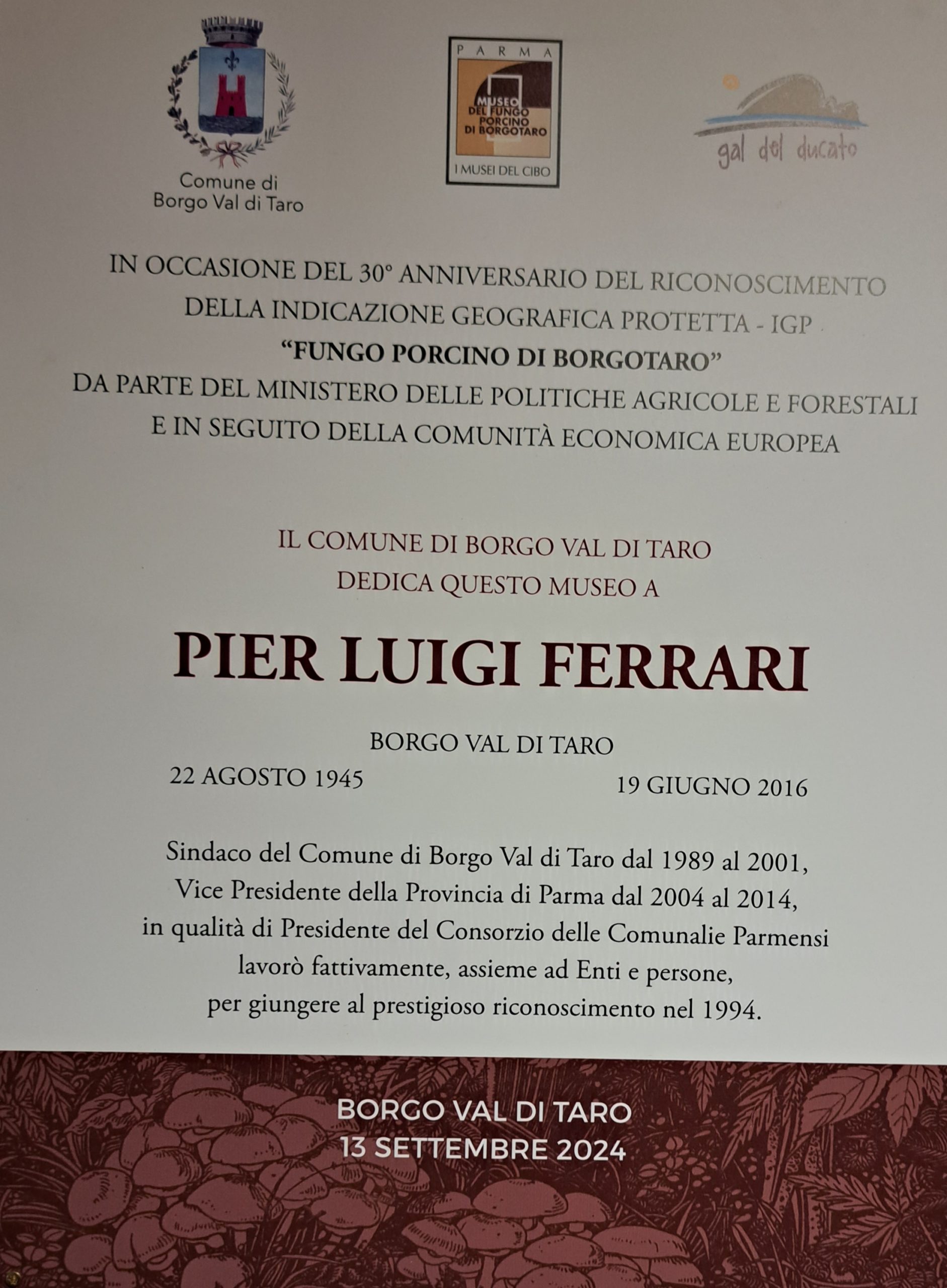 Borgotaro ricorda Pier Luigi Ferrari, intitolandogli il Museo del Fungo; a otto anni dalla sua improvvisa scomparsa, in occasione del 30esimo anno dal riconoscimento ufficiale da parte dell’Unione Europea della denominazione IGP per il fungo porcino di Borgotaro. Il suo capolavoro da amministratore.