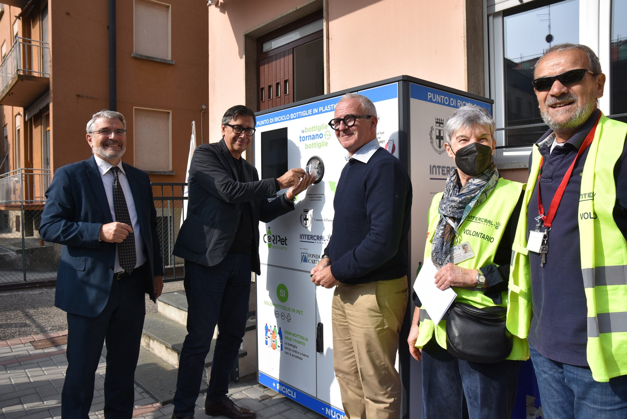 Nella nuova sede di Intercral, inaugurata giusto un anno fa, si è inserito felicemente questo impianto come servizio alla collettività, tra i tanti che Intercral offre alla città, nel segno dell’assistenza, dell’offerta di servizi e attrezzature e di attività formative e culturali per tutte le età. Taglio del nastro e prima bottiglia in PET aspirata dal nuovo impianto con l’Assessore Gianluca Borghi, Massimo Pinardi Presidente Intercral, Massimo di Molfetta consulente ambientale di Corepla, Alessandro Angella e Andrea Peri del Settore Tutela Ambientale del Comune di Parma.