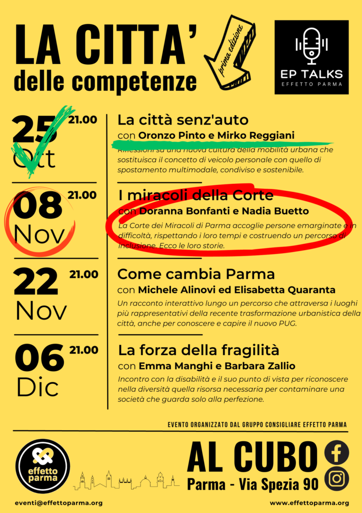 Sono solo due semplici ma significative testimonianze della serata organizzata mercoledì scorso da Effetto Parma al Cubo, secondo dei quattro appuntamenti degli EP TALKS e nel quale si è parlato dei “Senzatetto/Senza tutto”, come li definisce Nadia Buetto, Presidente de La Corte dei Miracoli.