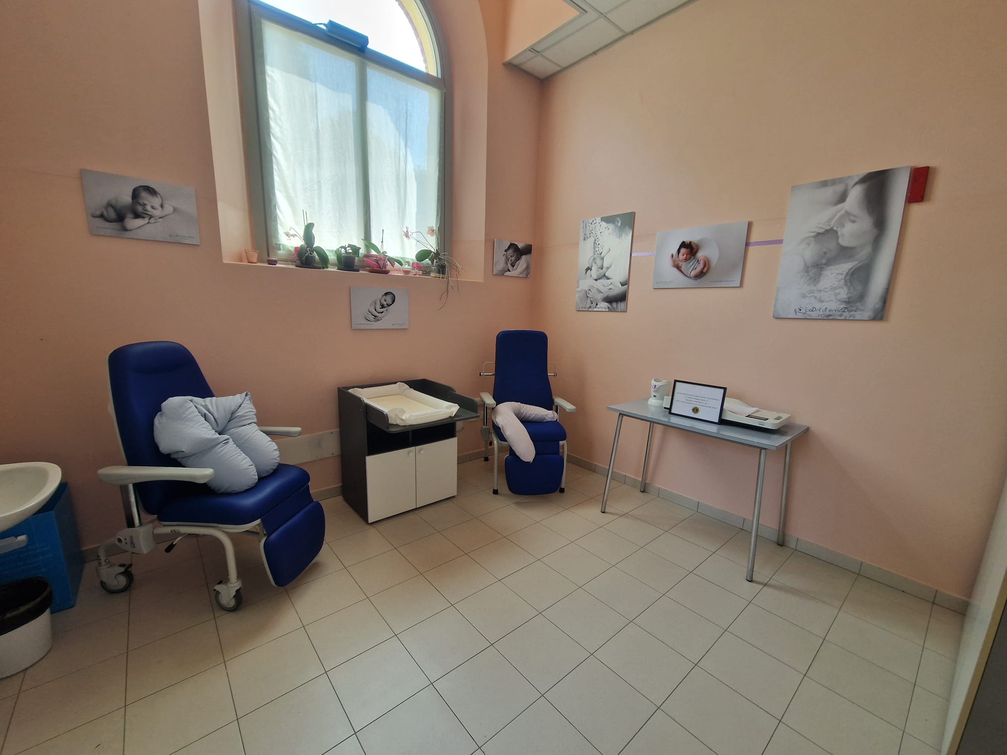 Completano gli arredi una ulteriore sedia per l’allattamento e la bilancia, per controllare il peso dei neonati prima e dopo la poppata. Le pareti tinteggiate di rosa tenue sono abbellite dalle foto di “Ladri di emozione”, gli scatti sulla maternità e primissima infanzia della fotografa Daniela Zanella.
