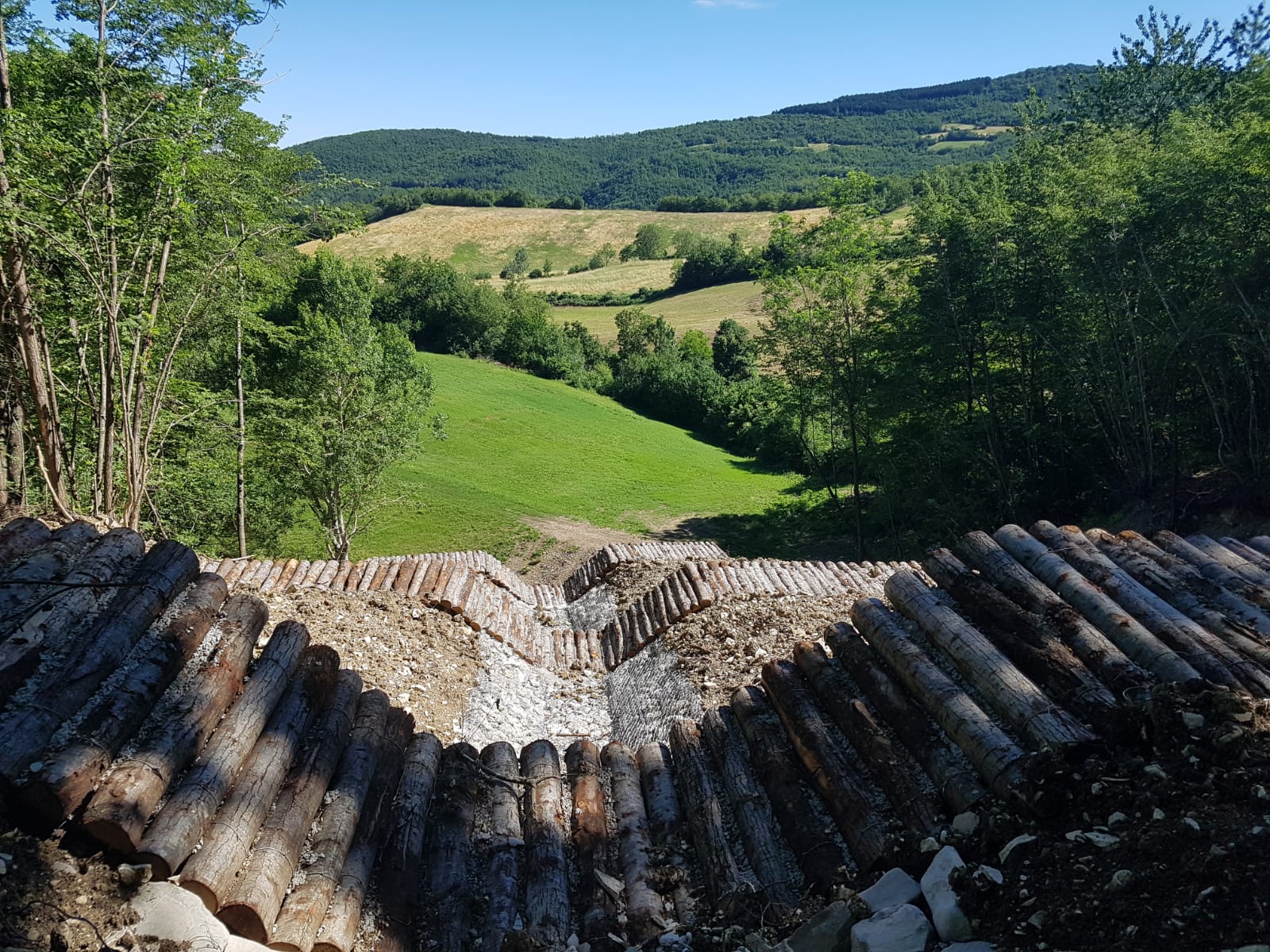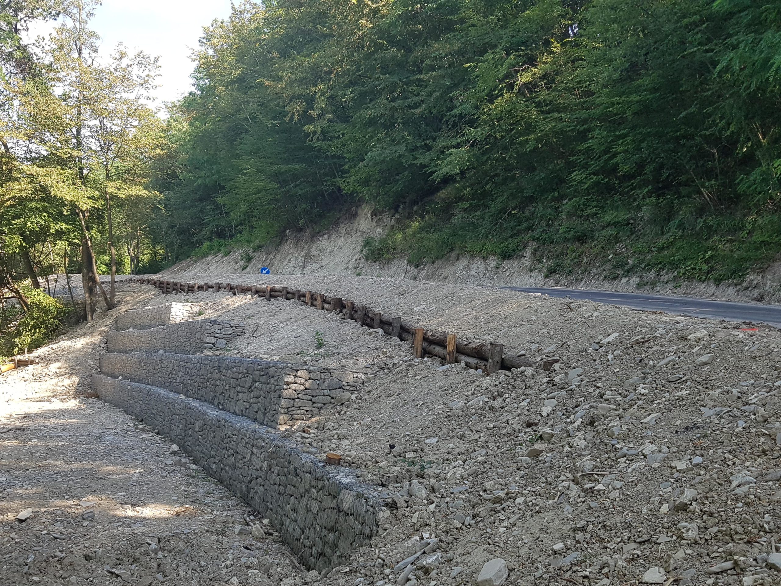 Il nuovo alveo, dopo una sagomatura, è stato rivestito con materassi in gabbia metallica stipati di materiale lapideo per prevenire erosione al fondo, garantendo così la stabilità delle briglie stesse e dell’intero versante. Si è poi provveduto alla costruzione di un’opera di sostegno in gabbioni a rete metallica di altezza 4 metri con fronte anteriore gradonato e lunghezza di 40 metri nel tratto basso dell’area di intervento, quello con scarpata più ripida e instabile; e ad una seconda opera di sostegno in gabbioni a rete metallica di altezza 2 metri con fronte anteriore gradonato e lunghezza di 20 metri nel tratto alto dell’area di intervento. La susseguente realizzazione di drenaggi profondi trasversali alla scarpata stradale manterrà a quota obbligata le acque sotterranee e servirà a prevenire la saturazione della parte alta del pendio. L’intervento è stato concluso con la posa di una palizzata in legno a sostegno della scarpata stradale, il tombamento della cunetta a cielo aperto esistente, l’asfaltatura della carreggiata e l’installazione del guard-rail di protezione.