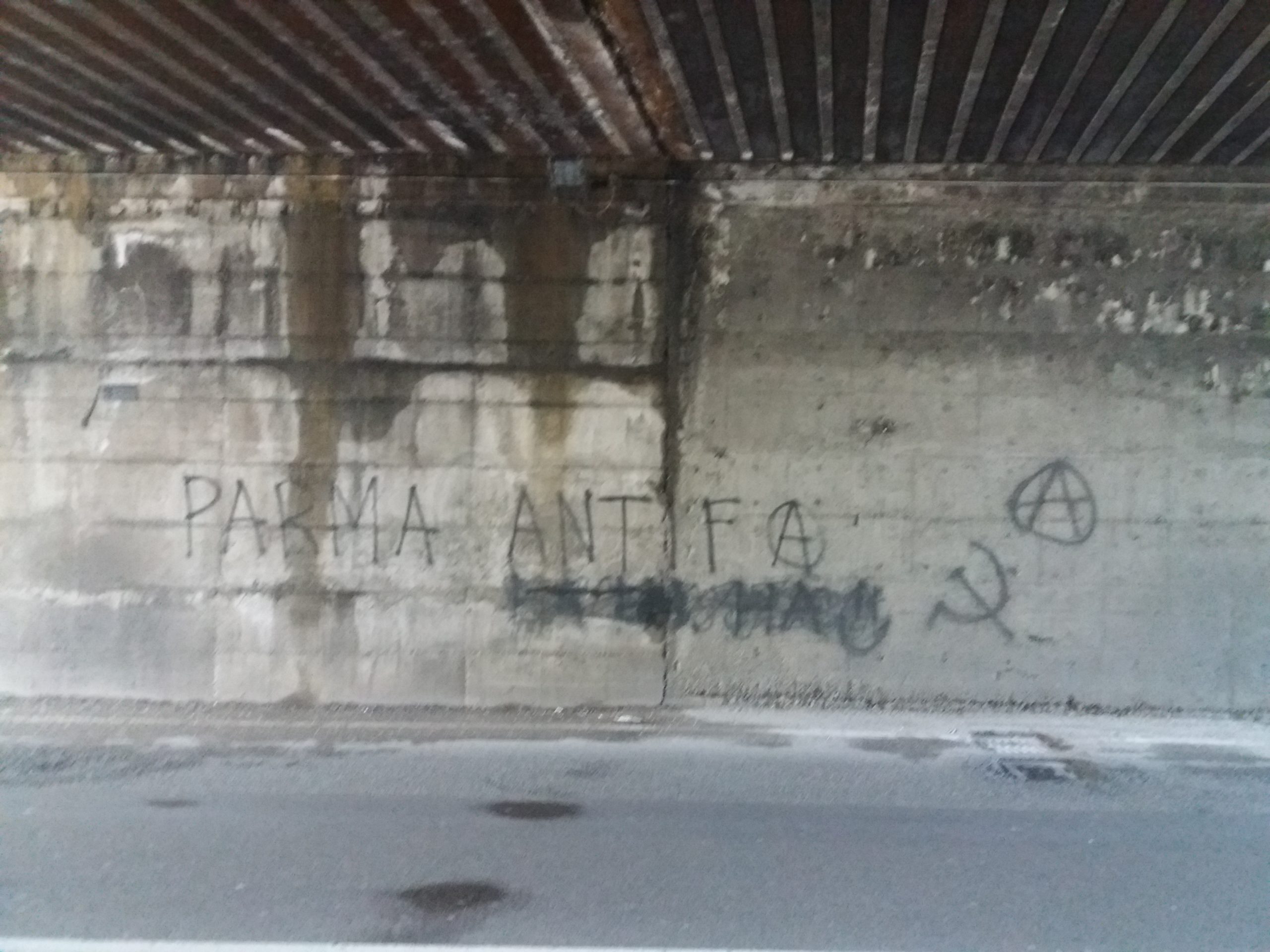 La prima, sebbene non rivendicata da alcuno, dovrebbe essere riconducibile a gruppi di destra, la seconda è firmata con orgoglio da “Parma Antifascista”, con tanto di falce e martello.