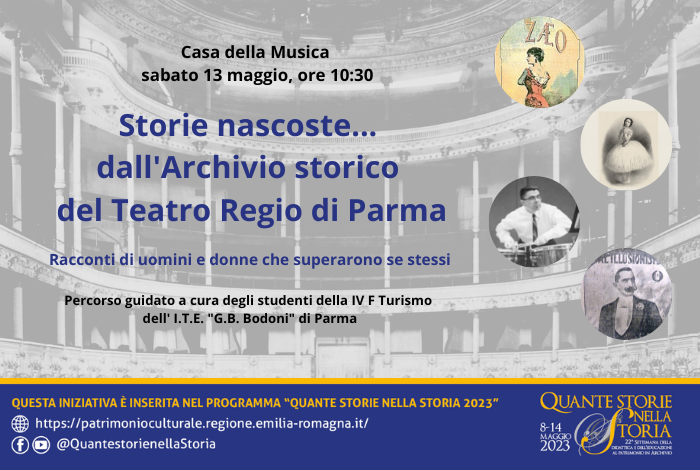 L’esito di questo lavoro sarà presentato al pubblico dagli stessi studenti, sabato 13 maggio, a partire dalle ore 10.30, all’Archivio del Teatro Regio di Casa della Musica, attraverso una speciale e inedita visita guidata, “Storie nascoste…dall’Archivio storico del Teatro Regio di Parma”, che si snoderà in un percorso in sei tappe in cui i visitatori saranno condotti alla scoperta di ballerine, attrici, illusionisti, artisti del circo, uomini e donne che prenderanno vita raccontando come è possibile superare se stessi e i limiti del proprio corpo.