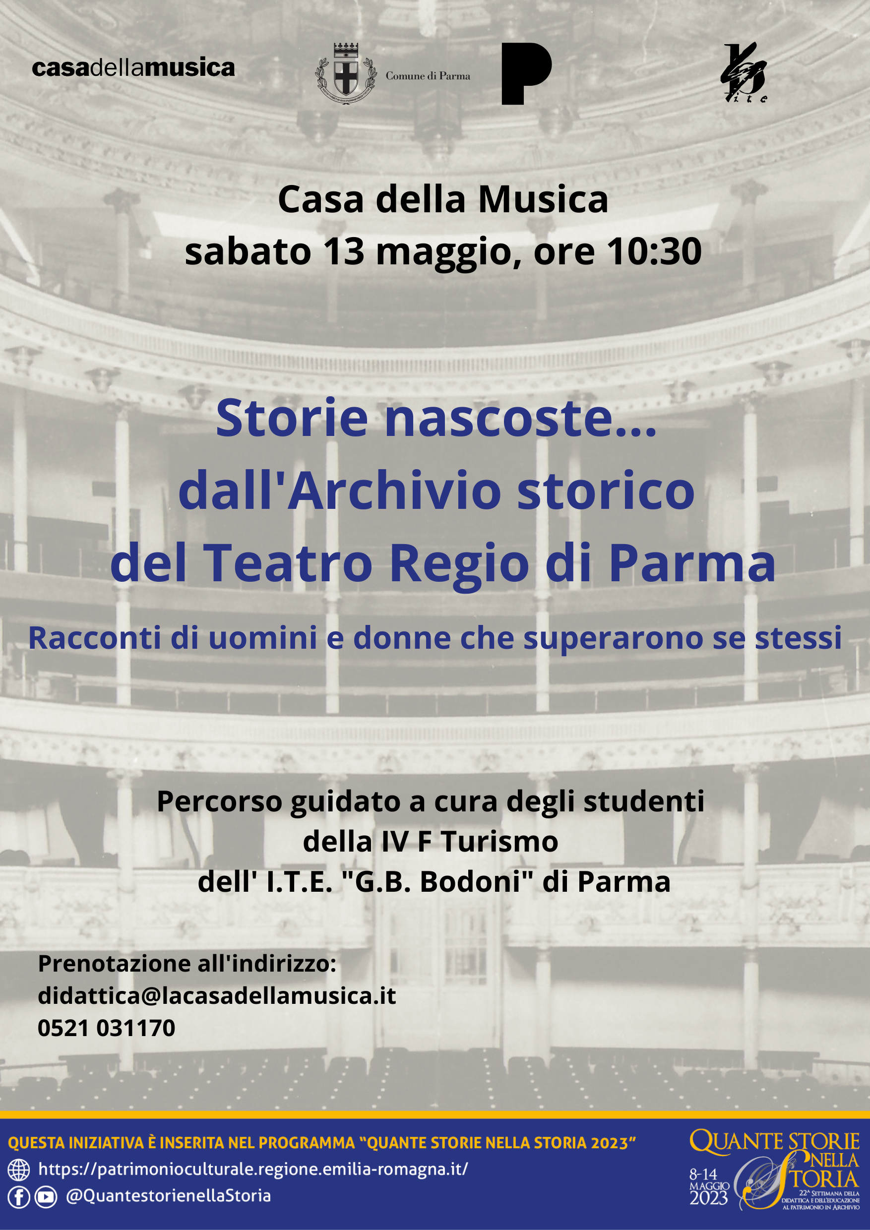 Anche quest’anno Casa della Musica – Archivio storico del Teatro Regio di Parma partecipa all’iniziativa “Quante storie nella Storia. Settimana della didattica e dell’educazione al patrimonio in archivio”, promossa dalla Regione Emilia-Romagna in collaborazione con ANAI – Associazione nazionale archivistica italiana – Sezione Emilia Romagna e la Soprintendenza archivistica e bibliografica dell’Emilia Romagna, presentando al pubblico i risultati dei progetti svolti durante l’anno con le scuole di vario ordine e grado, tramite eventi aperti a tutti.