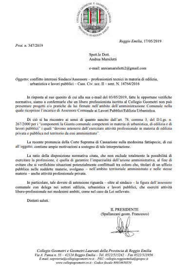 La risposta dell’Ordine dei Geometri di Reggio Emilia non lascia spazio ad ambiguità: “In risposta al suo quesito di cui alla sua e-mail del 03/05/2019, fatte le opportune verifiche normative, siamo a confermarle che un libero professionista iscritto al Collegio Geometri non può presentare progetti e/o pratiche da lui firmate nell’ambito dell’amministrazione Comunale nella quale ricoprisse l’incarico di Assessore Comunale ai Lavori Pubblici/Edilizia Urbanistica. Di ciò si ha riscontro ai sensi di quanto sancito dall’art. 78, comma 3, del D.Lgs. n.267/2000 per i “componenti la Giunta comunale competenti in materia di urbanistica, di edilizia e di lavori pubblici” i quali “devono astenersi dall’esercitare attività professionale in materia di edilizia privata e pubblica nel territorio da essi amministrato”. La recente pronuncia della Corte Suprema di Cassazione sulla medesima fattispecie, di cui all’oggetto, contiene ampie motivazioni a sostegno di tale interpretazione. […].” (leggi risposta integrale del Collegio dei Geometri di Reggio Emilia)
