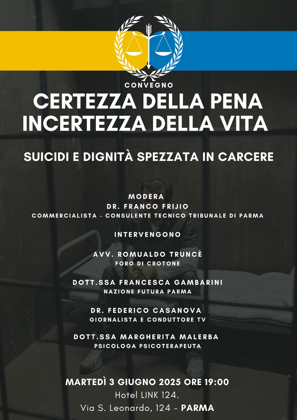 Martedì 3 giugno, dalle ore 19, presso la sala conferenze dell’hotel Link di Parma (via San Leonardo 124) si terrà il convegno intitolato “Certezza della pena, incertezza della vita”, un’occasione di confronto e dibattito organizzata da Franco Frijio, commercialista e consulente tecnico del Tribunale di Parma, per porre l’attenzione sulle condizioni di vita delle persone carcerate all’interno degli istituti penitenziari italiani.