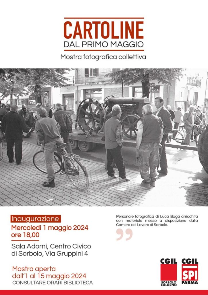 Nell’ambito delle iniziative collaterali al Primo Maggio Festa dei Lavoratori, CGIL zona Sorbolo Colorno e SPI CGIL Parma, in collaborazione con il Comune di Sorbolo, invitano la cittadinanza alla mostra fotografica CARTOLINE DAL PRIMO MAGGIO, personale di Luca Baga arricchita con materiale messo a disposizione dalla Camera del Lavoro di Sorbolo.