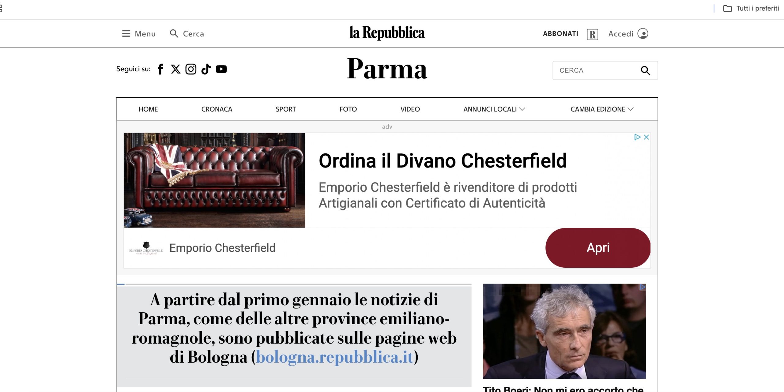 “A partire dal primo gennaio le notizie di Parma, come delle altre province emiliano-romagnole, sono pubblicate sulle pagine web di Bologna ((bologna.repubblica.it)”.