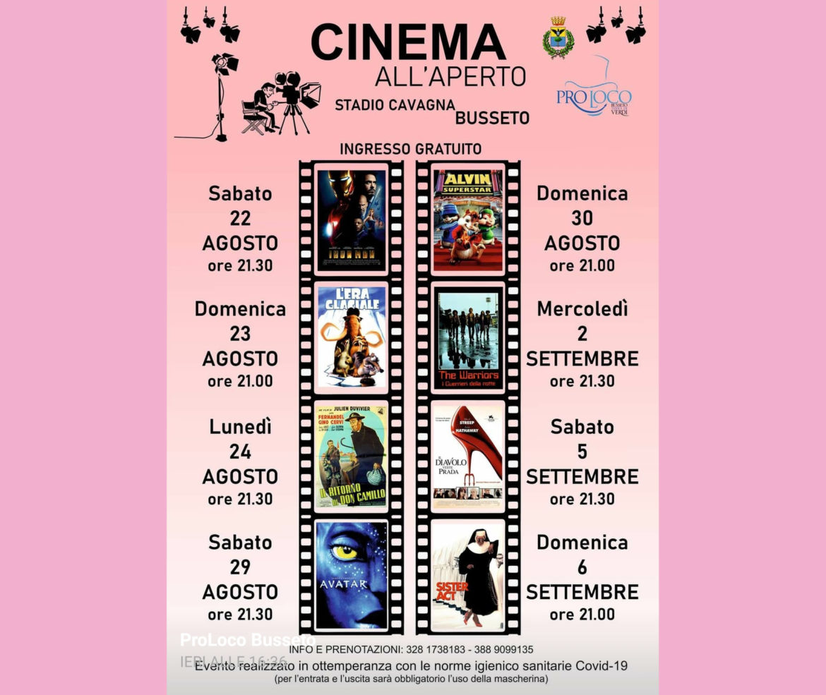 L’iniziativa, gratuita e indirizzata a tutte le fasce d’età, si svolgerà nel pieno rispetto dei protocolli dell’emergenza sanitaria che verranno emanati dalle autorità competenti, concepita in modo da garantire la totale sicurezza per gli spettatori in ogni fase dell’evento. “Iniziamo il 22 agosto con la proiezione di Iron Man, per poi proseguire la serata successiva con L’Era Glaciale. Lunedì 24 – spiega Comati – sarà la volta di un grande classico ‘Il ritorno di Don Camillo”. La rassegna proseguirà sabato 29 con “Avatar” e domenica 30 con “Alvin Superstar”; mercoledi 2 settembre sarà proiettato “The Warriors”. La conclusione nel weekend del 5 e 6 settembre con “Il diavolo veste Prada” e “SisterAct”. “Invitiamo i bussetani – conclude Comati – a partecipare numerosi al Cinema all’Aperto, con l’auspicio che l’iniziativa diventi un appuntamento stabile per l’estate bussetana. All’ingresso e all’uscita, nel rispetto delle regole, è obbligatorio l’uso della mascherina”.