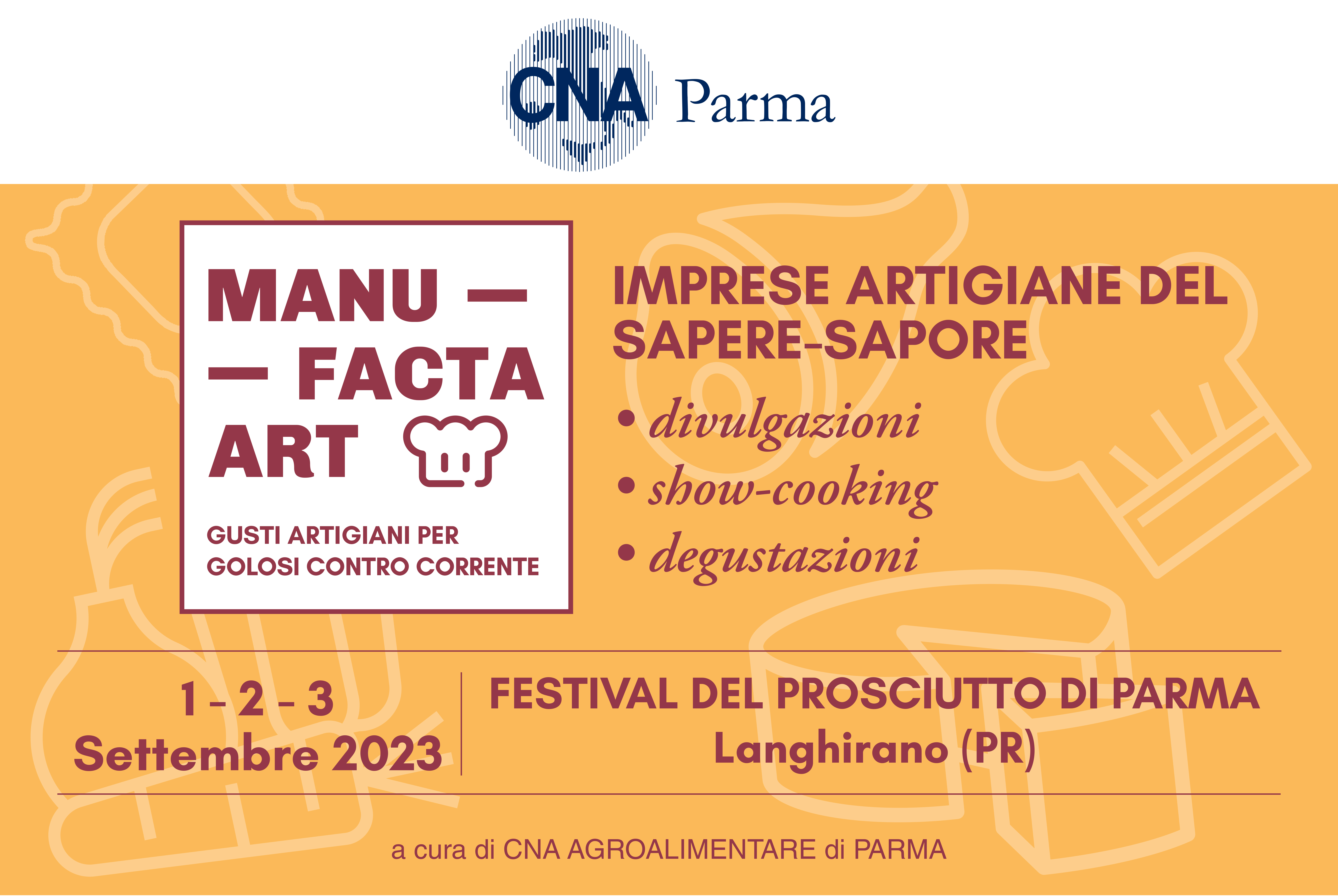 CNA Agroalimentare di Parma sarà presente alla XXVI edizione del Festival del Prosciutto di Parma a Langhirano con Manu Facta Art: gusti artigiani per golosi contro corrente, uno spazio-evento dedicato ai maestri artigiani del nostro territorio che impreziosiranno il Festival con divulgazioni, show-cooking, degustazioni e proporranno un menù creato appositamente per l’occasione, dove si potranno assaporare le prelibatezze artigianali delle aziende aderenti al progetto e acquistare i loro prodotti. Un vero e proprio “ristorante-dispensa” è ciò che CNA porterà a Langhirano dal 1 al 3 settembre 2023, insieme a piacevoli momenti di racconto del sapere artigiano, squisiti assaggi e ospiti che interagiranno con il pubblico. Le imprenditrici e gli imprenditori che arricchiranno il menù con i propri deliziosi prodotti artigianali sono: Birrificio Zucker – Birrificio Biologico (Sanguinaro di Fontanellato), Prosciuttificio F.lli Verduri – Prosciuttificio (Neviano degli Arduini), 50 Bio srl – Produzione confetture, marmellate, condimenti (Salsomaggiore Terme), È Pane – Panificio Artigianale (Fidenza) e Pi.fo.nomia – Produzione Pizze, Focacce e Gastronomia (Parma). Mentre le aziende presenti con i propri prodotti in vendita saranno: Panificio Monte Dosso – Produzione pane e pizza (Varsi), Frantoio Lo Conte – Olio della Romagna, GFH Srl Gluten Free House – Prodotti senza glutine (Parma) e VIVI Ferments, Produzione Bevande e Alimenti fermentati (Salsomaggiore Terme).