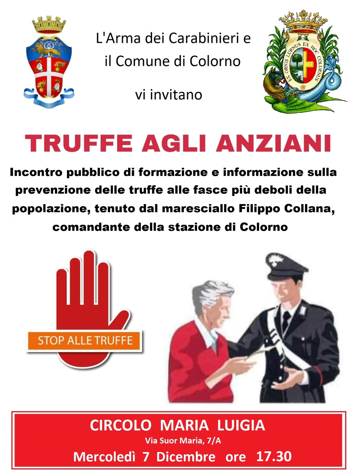 A illustrare i pericoli principali e i modi per cautelarsi da questo tipo di raggiri particolarmente odiosi, sarà il maresciallo Filippo Collana, comandante della stazione dei carabbinieri colornese.