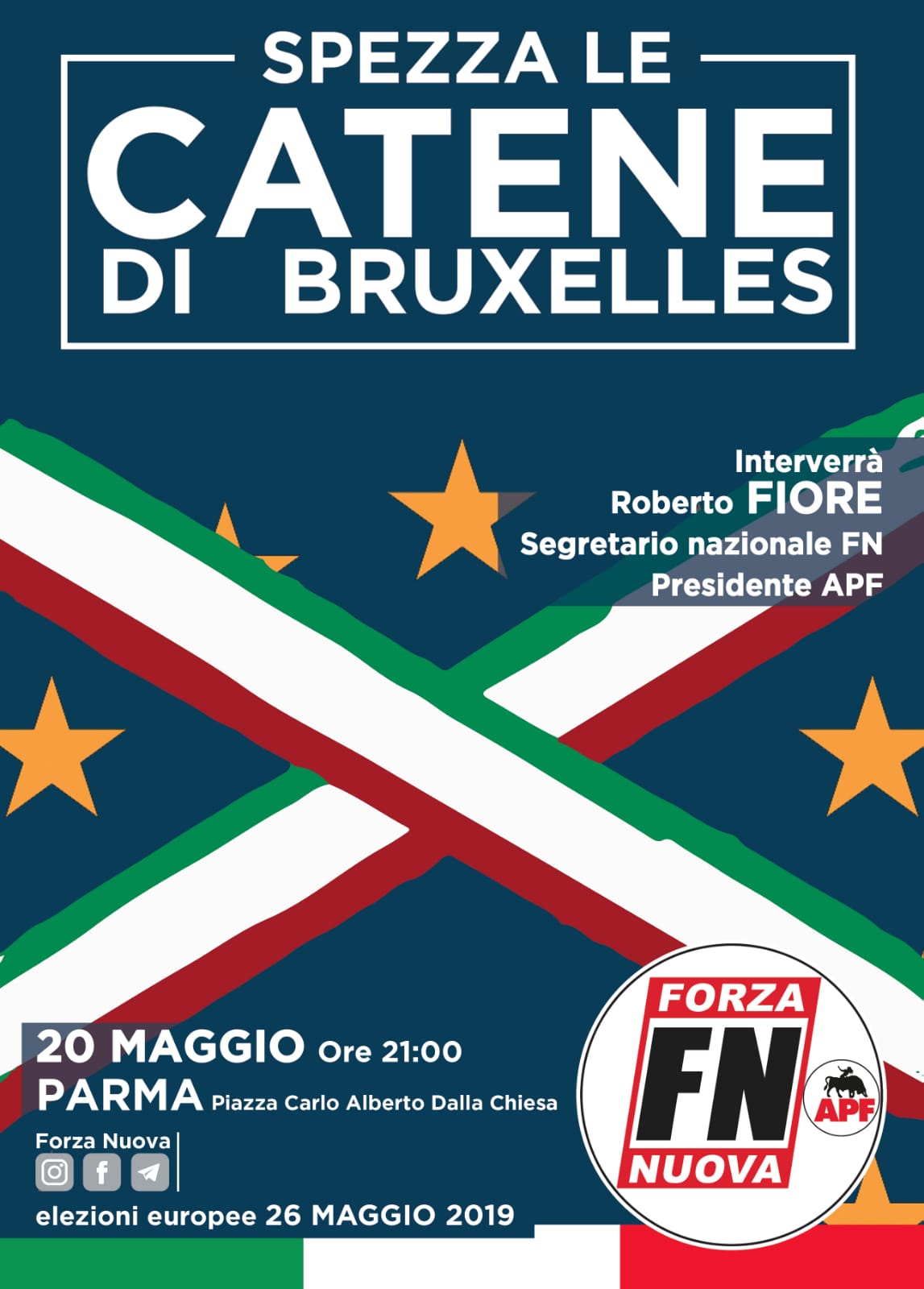 Comizio di Fiore (Forza Nuova) in Piazzale Dalla Chiesa di UG 18 Maggio 2019 18 Maggio 2019 45 A chiusura della campagna elettorale, Forza Nuova terrà un comizio in Piazzale Dalla Chiesa, dove interverrà il Segretario Nazionale di F.N. Roberto Fiore e verranno presentati i candidati alle Europee di FORZA NUOVA APF circoscrizione nord-est.