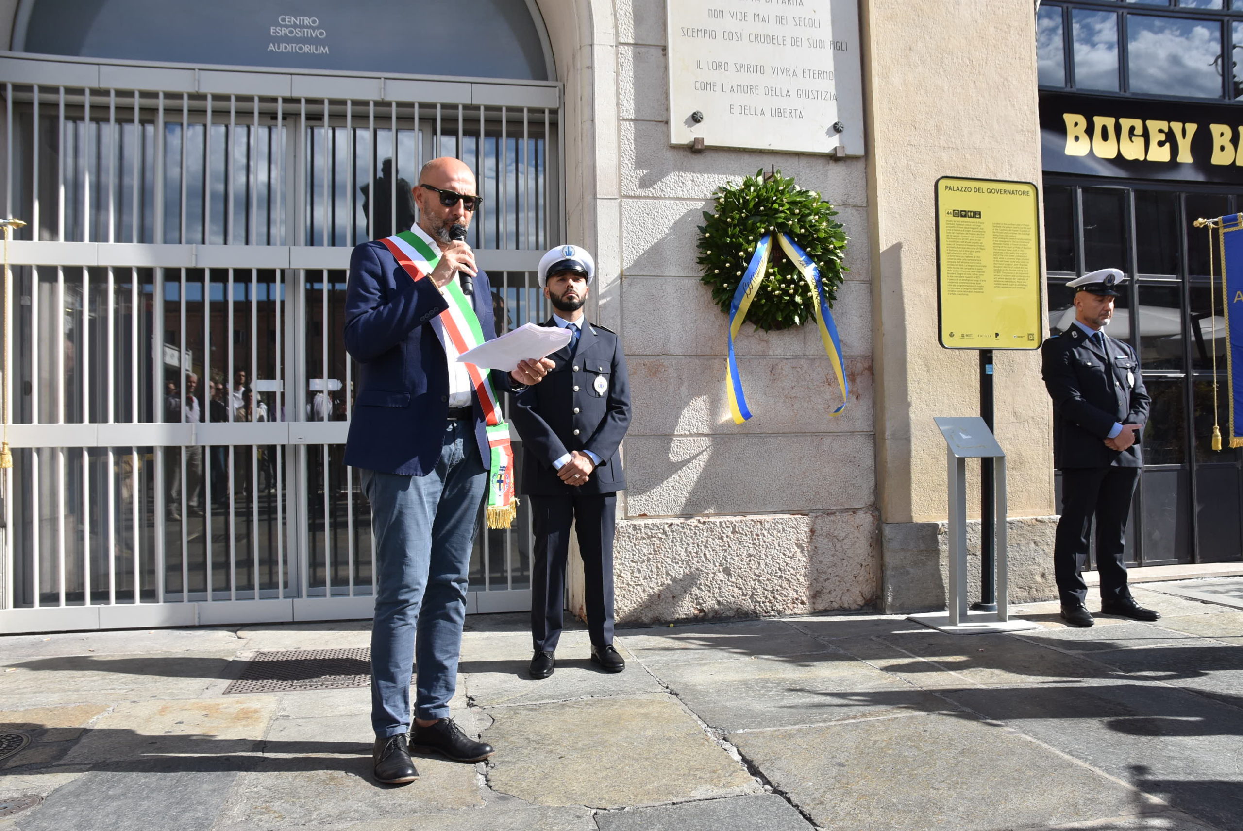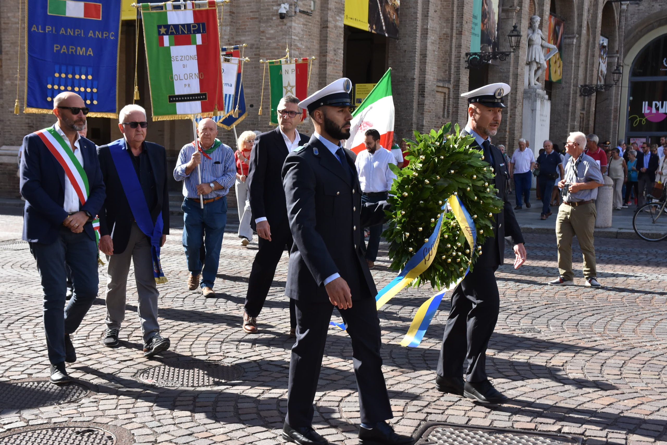 Alle 10 si è formato il corteo sotto i Portici del Grano, per raggiungere piazza Garibaldi con sosta davanti alla lapide commemorativa all’ingresso del Palazzo del Governatore, dove è stata deposta una corona. Il presidente del Consiglio Comunale Michele Alinovi ha dato lettura di nomi di Sette Martiri scandita dal rintocco del campanone civico.