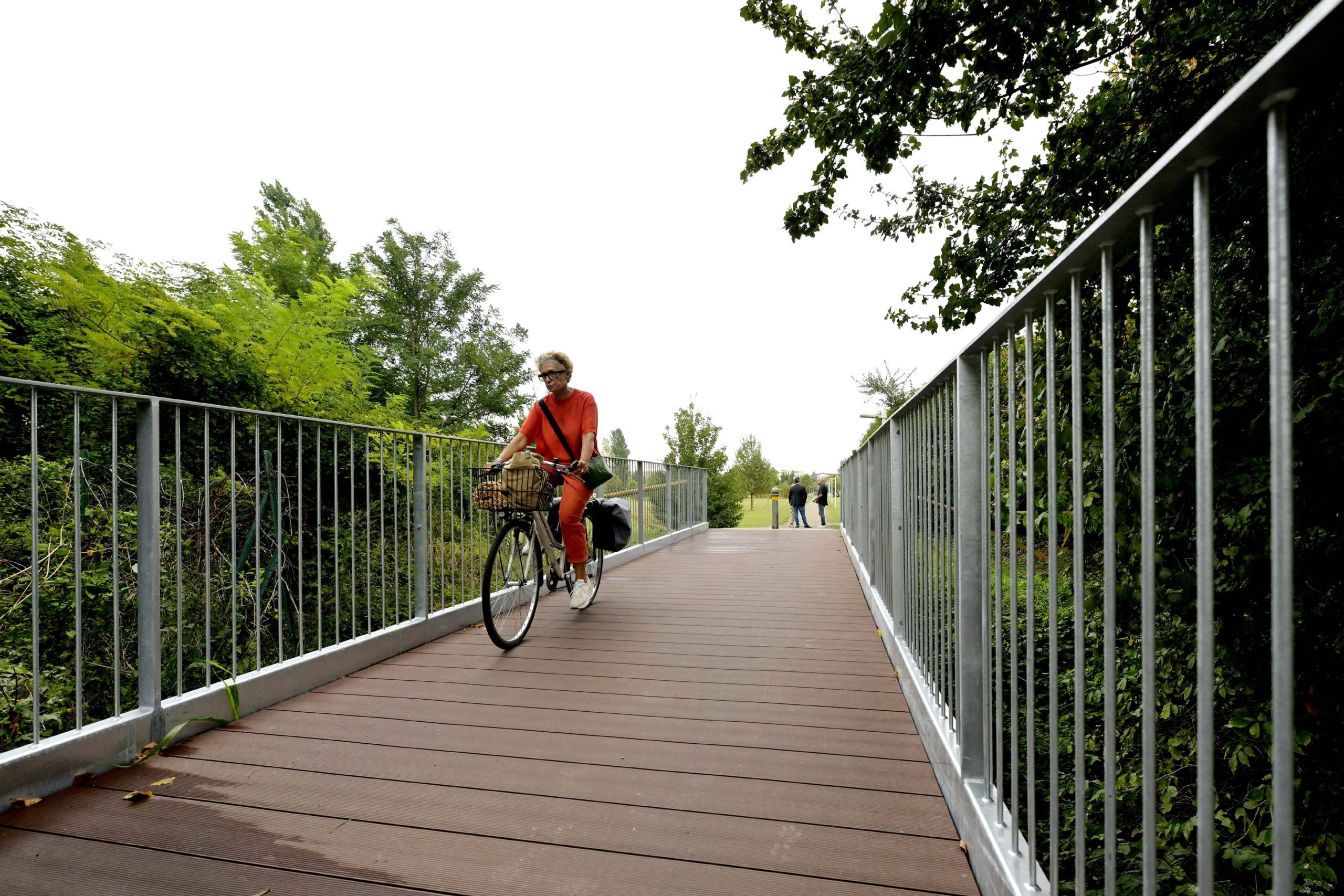 La nuova struttura in acciaio collega il Parco Laghi e il Parco Luca Attanasio, rafforzando la rete di percorsi dedicati alla mobilità dolce.