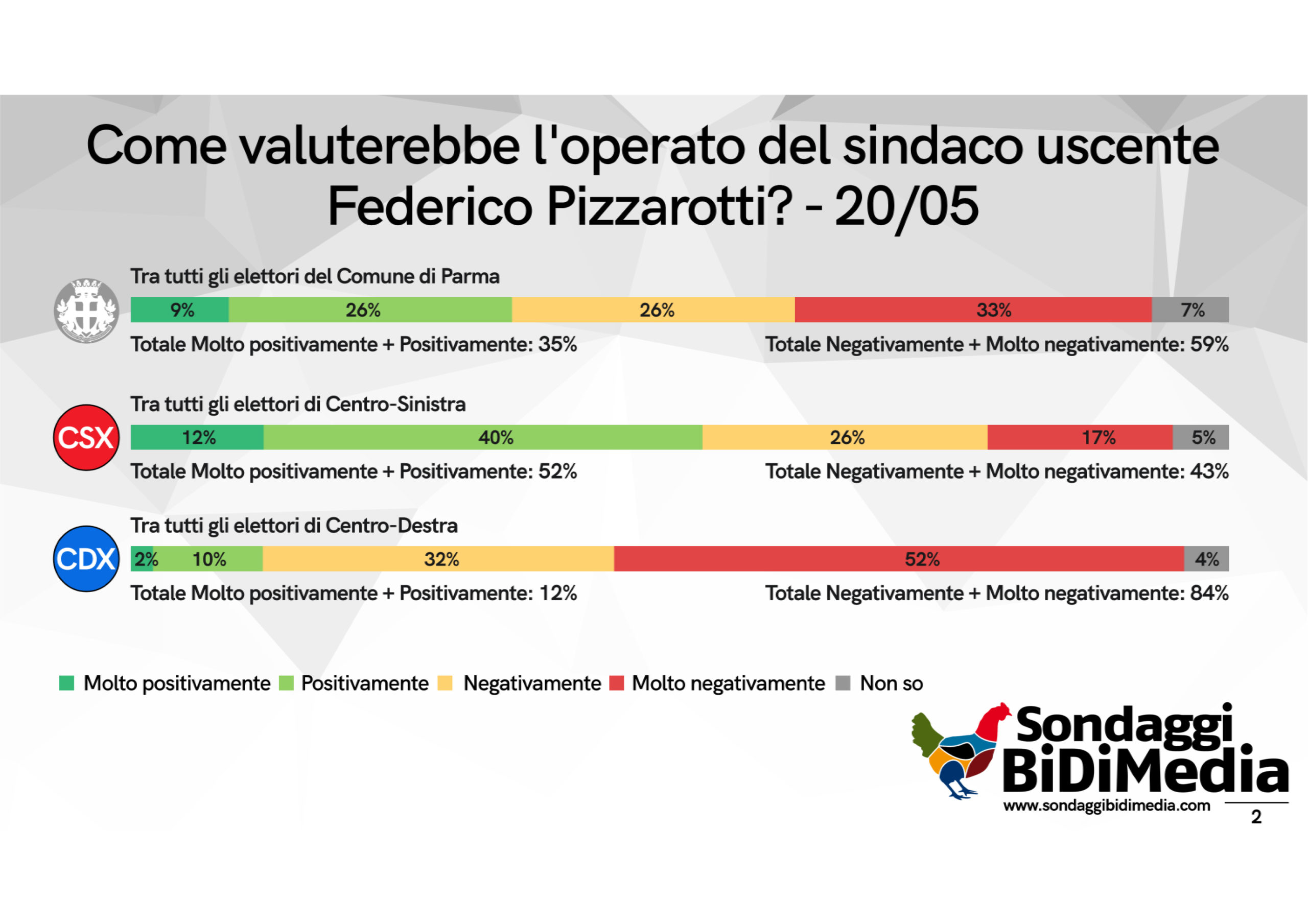 Federico Pizzarotti è apprezzato dal 35% dei parmigiani: questo l’esito della domanda sull’operato dell’amministrazione uscente. Un risultato non lusinghiero per il sindaco che comunque ha terminato i due mandati ed è impossibilitato a ricandidarsi. Nel precedente sondaggio condotto lo scorso novembre, l’operato del sindaco uscente aveva il 38% di voti positivi. In particolare, il 43% degli elettori di Centrosinistra non ha apprezzato l’operato di Pizzarotti, percentuale che sale all’84% tragli elettori di Centrodestra.