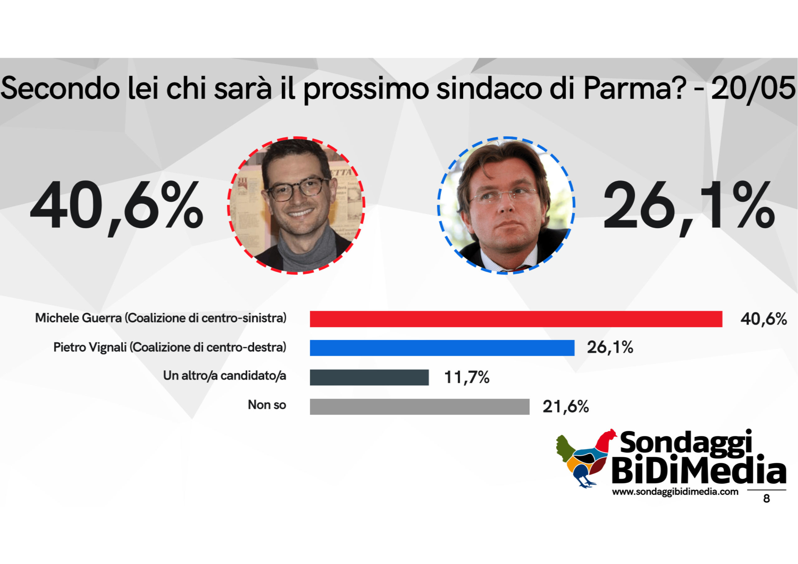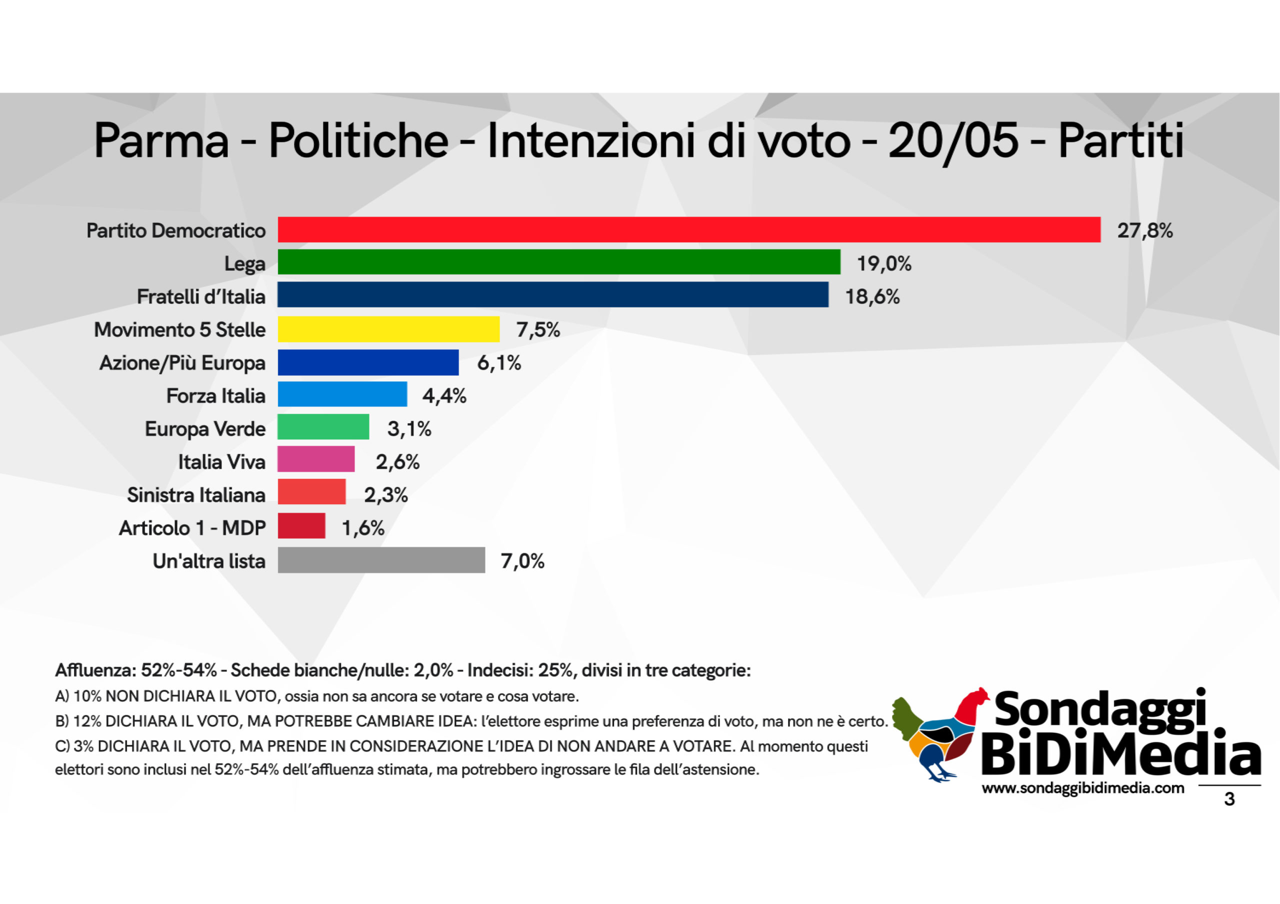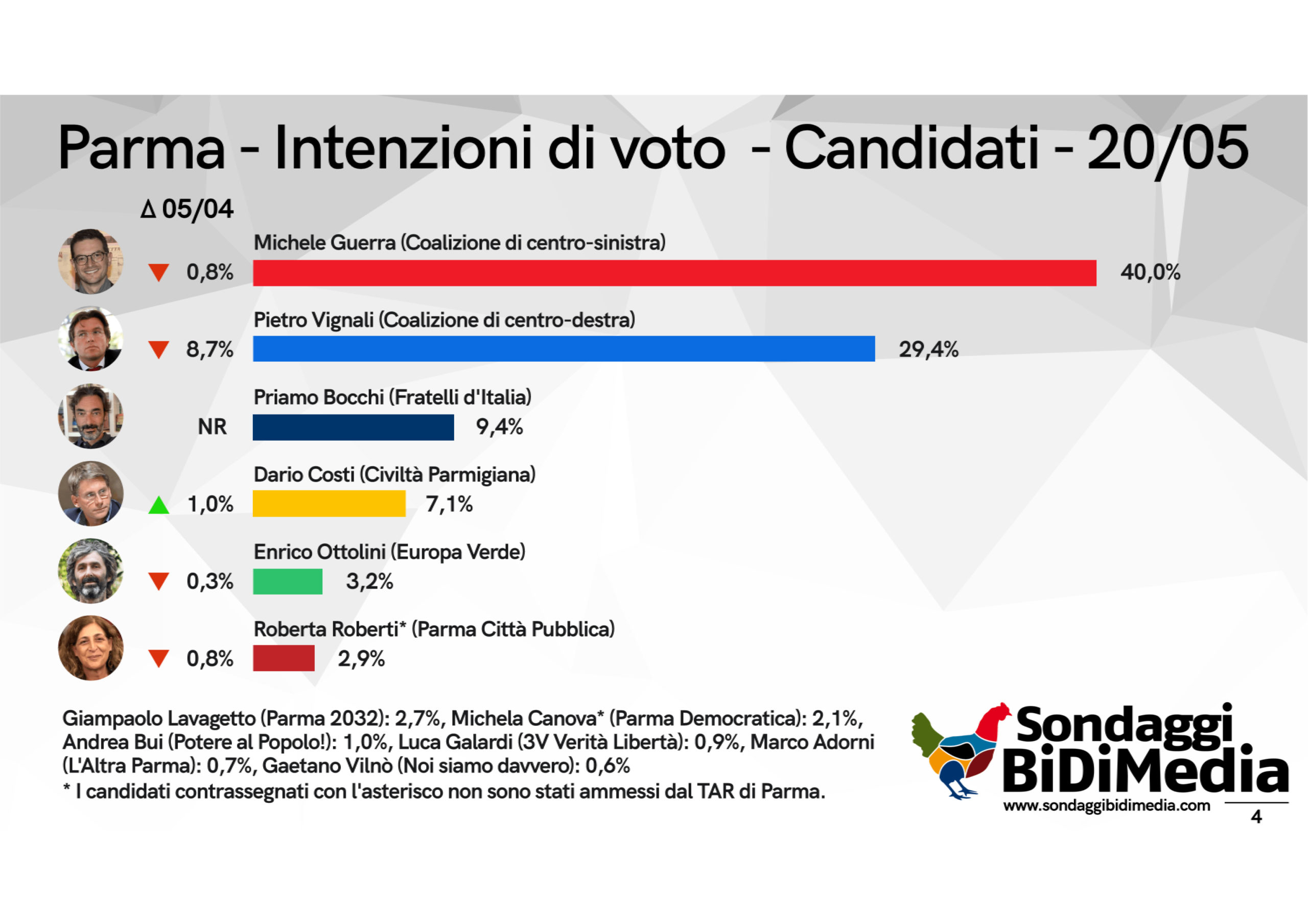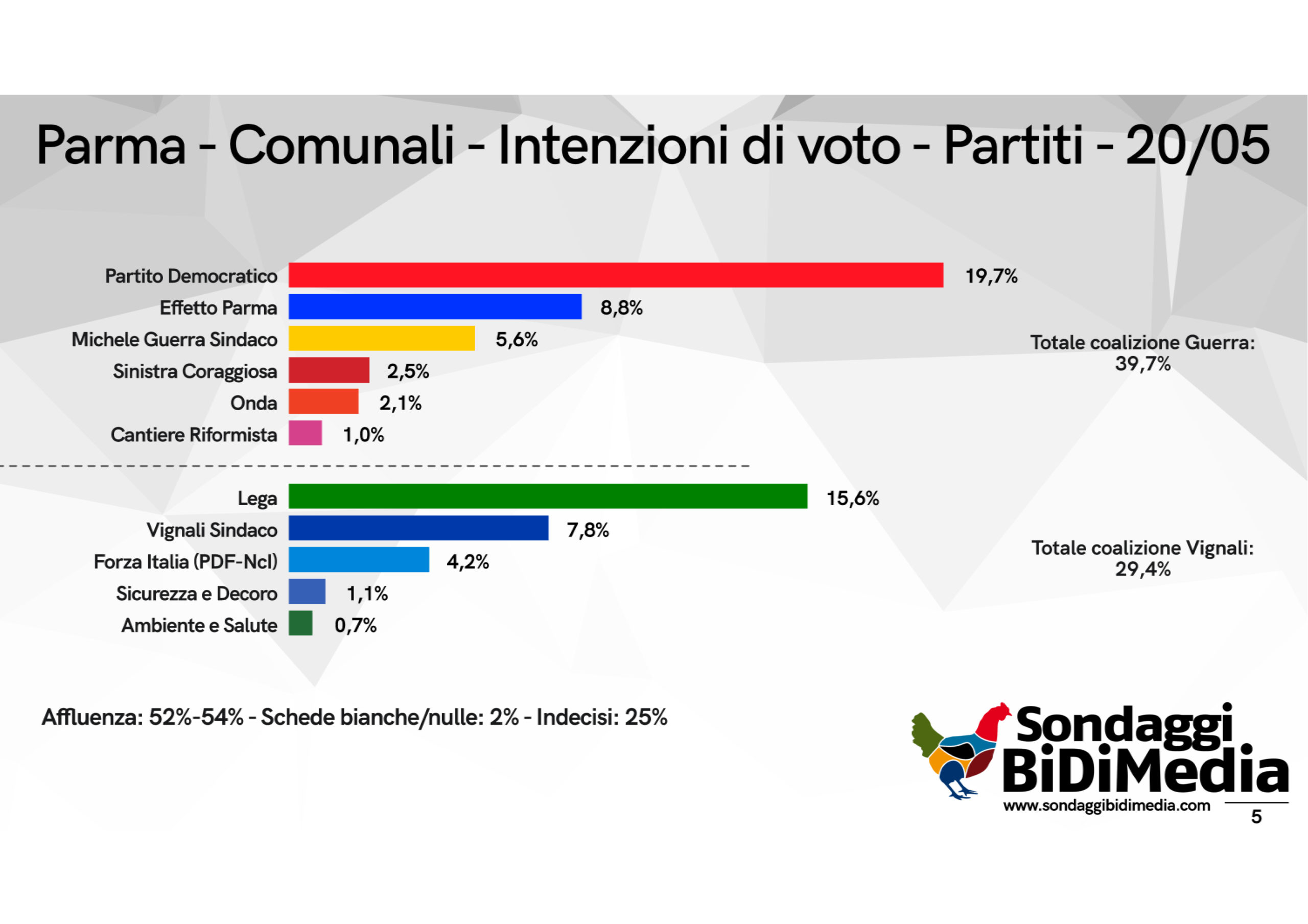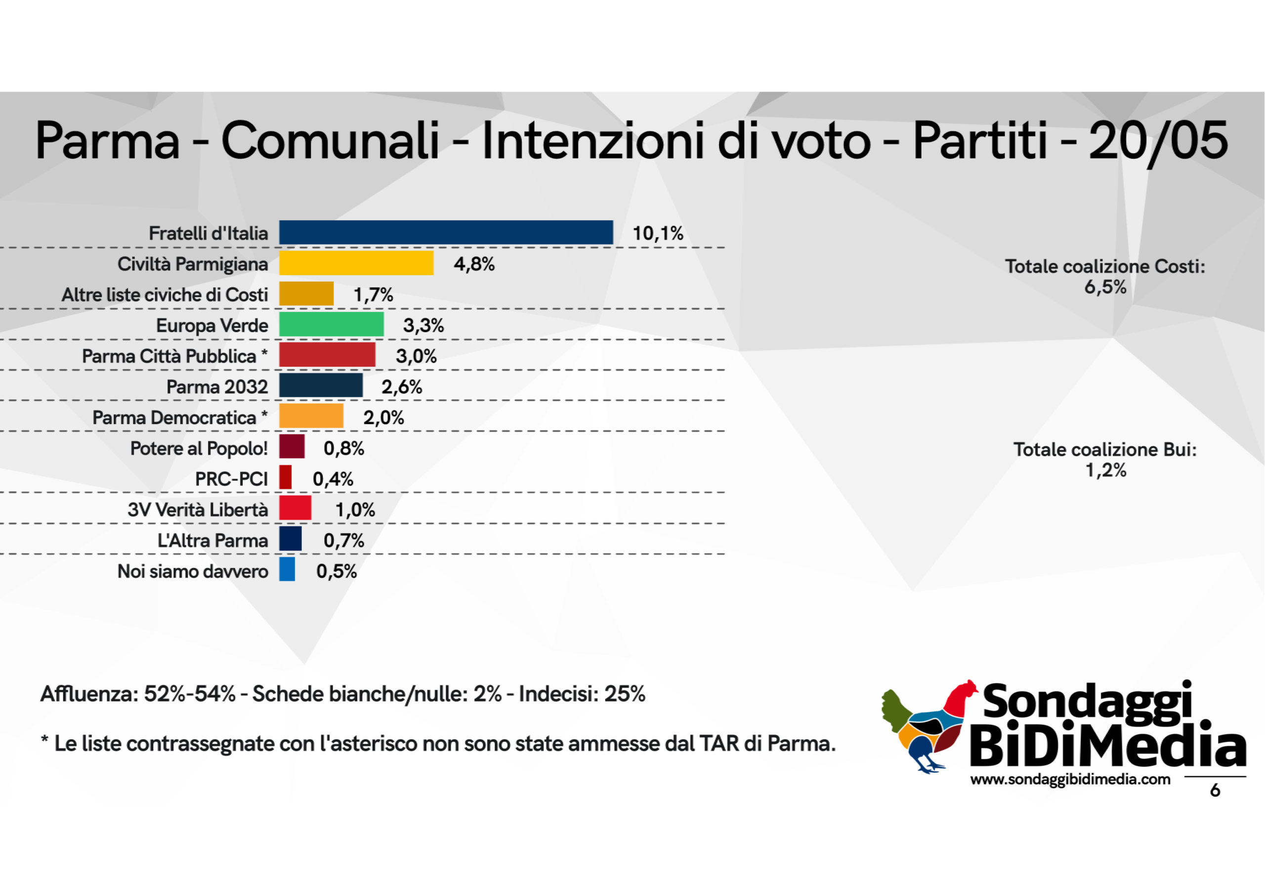 Seguono Effetto Parma (8,8%), la lista del sindaco uscente Pizzarotti, e le civica di Vignali, Guerra e Costi. A seguire tutte le altre liste. Da notare come il risultato delle liste ricalchi quello dei candidati, tranne che per Costi (7,1% come candidato, 6,5% come sommatoria della sua coalizione) e Bocchi (9,4% come candidato, 10,1% come lista). E’ probabile, comunque, che queste differenze si assottiglino ancora durante la campagna elettorale.