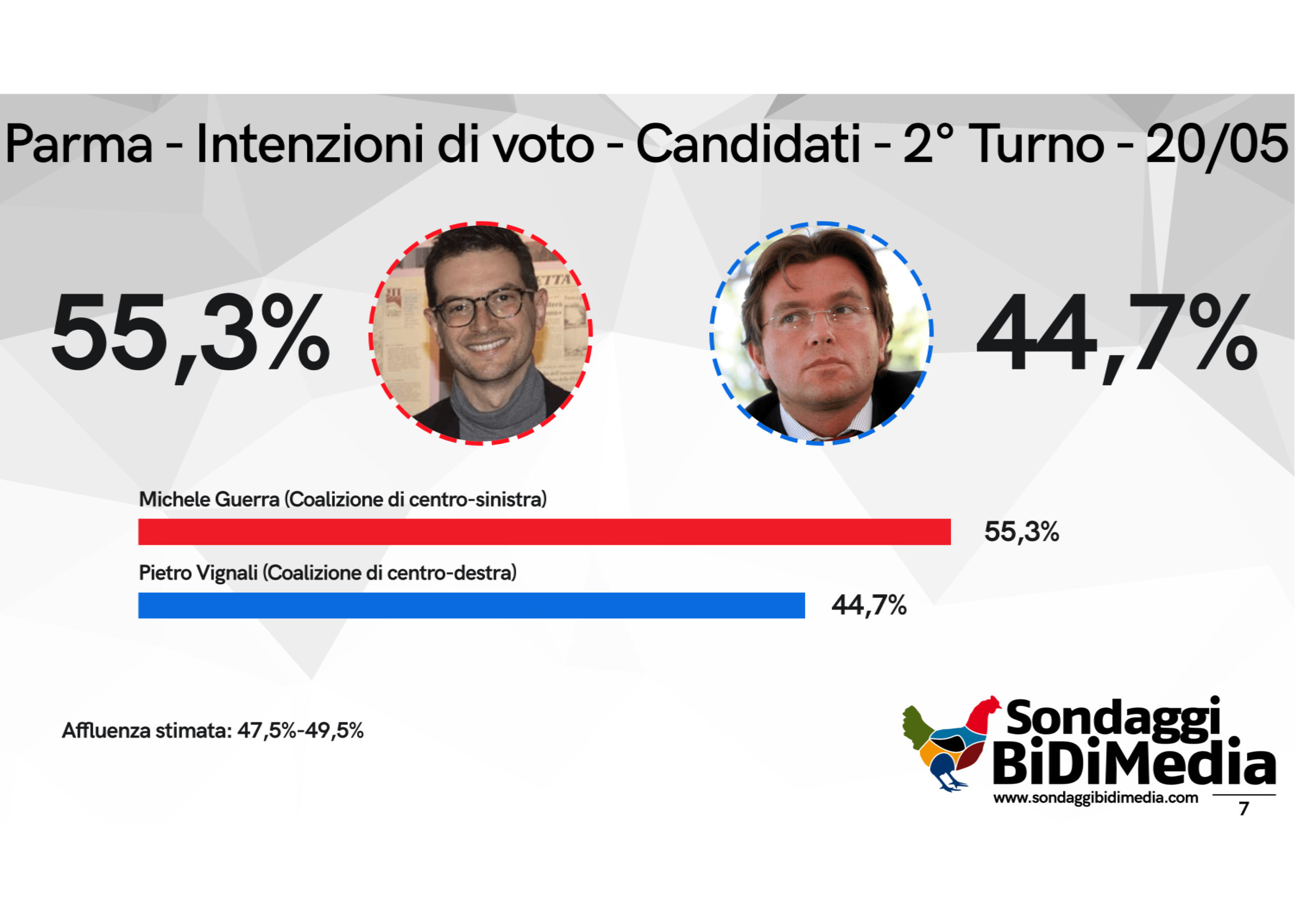 Il risultato del ballottaggio tra Michele Guerra e Pietro Vignali sembra essere relativamente scontato: il primo condurrebbe con oltre 10 punti di vantaggio rispetto al suo avversario, crescendo leggermente rispetto al precedente sondaggio in cui raggiungeva il 55%. I flussi di voto tra I e II turno, nonostante la presenza di nuove candidature, sono rimasti praticamente identici, con entrambi i candidati che riescono a recuperare voti dagli esclusi al ballottaggio, ma con il centrosinistra che riesce più facilmente a riportare al voto i propri elettori.