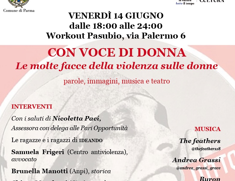 E’ in programma venerdì 14 giugno, dalle 18 alle 24, al Workout Pasubio, in via Palermo 6, “Con voce di donna. Le molte facce della violenza sulle donne”, parole, immagini, musica e teatro. L’evento è organizzato da “Ideando, associazione culturale giovanile per un pensiero critico e solidale”, con il contributo del Comune di Parma ed il coinvolgimento di Ciac – Centro Immigrazione Asilo Cooperazione di Parma e provincia onlus. Il progetto intende sollecitare una riflessione sulle diverse forme di violenza esercitate sulle donne: fisica, nelle relazioni, sul lavoro, sul piano mediatico, sul piano politico e sociale.