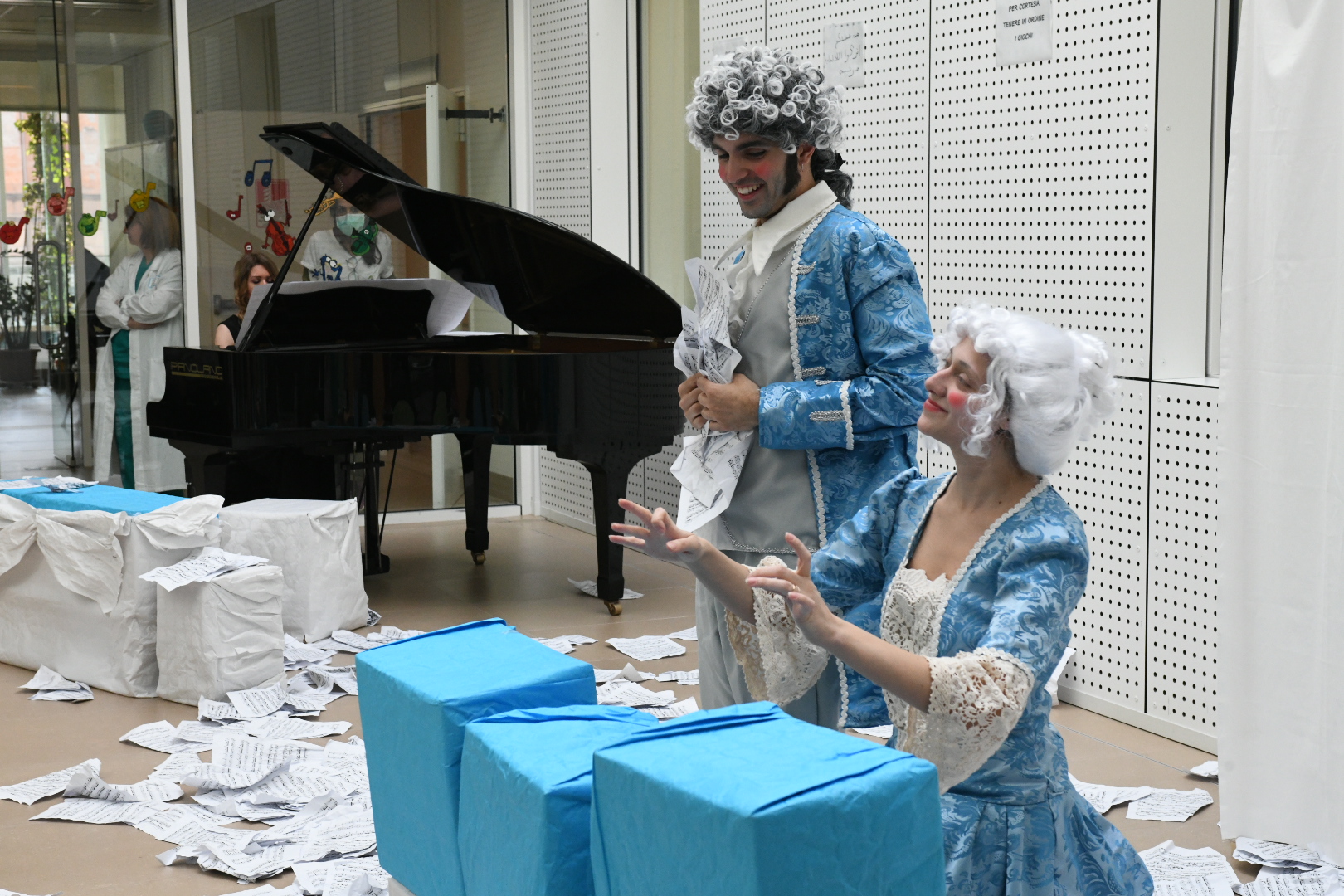 E non hanno perso una battuta dello spettacolo che si è svolto questa mattina nel cavedio dell’Ospedale dei bambini di Parma. Sharon Tomberli e Massimo Boschi, accompagnati da Iulia Relinda Ratiu al pianoforte, un pianoforte vero a mezza coda, hanno raccontato loro in modo divertente e rocambolesco la vita e le avventure di due fratellini accomunati da cuore, passione e un talento innato: Wolfgang Amadeus Mozart e la sorella Maria Anna. Perché in realtà, in famiglia, i geni erano due.