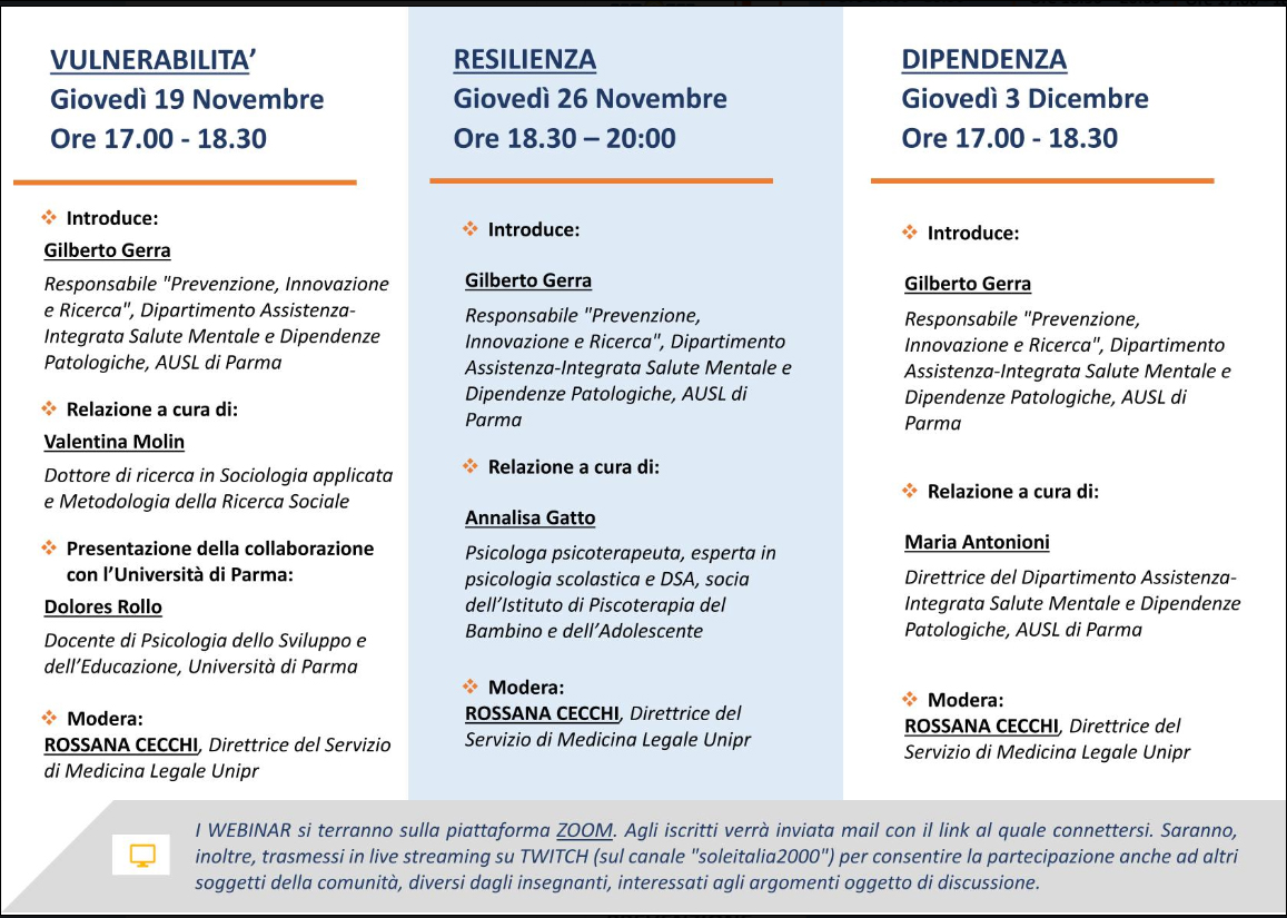 Nei tre incontri, introdotti da Gilberto Gerra, responsabile Prevenzione, innovazione e ricerca del Dipartimento assistenziale integrato Salute mentale e Dipendenze patologiche dell’Ausl, e moderati da Rossana Cecchi, direttrice del Centro di Servizi per la Salute, Igiene e Sicurezza nei luoghi di lavoro dell’Università di Parma,  verranno approfonditi da esperti del settore altrettanti concetti base legati alla prevenzione: la vulnerabilità, la resilienza e la dipendenza. Partecipare è facile e gratuito: sarà necessario compilare un form online, accessibile dal sito https://prevenzioneparma.blogspot.com/ e si riceverà via mail un link di collegamento alla piattaforma “Zoom”, da cui seguire gli incontri.  I webinar verranno inoltre trasmessi in streaming sul canale “soleitalia2000” della piattaforma Twitch, per consentire la partecipazione a tutti, non solo agli insegnanti.