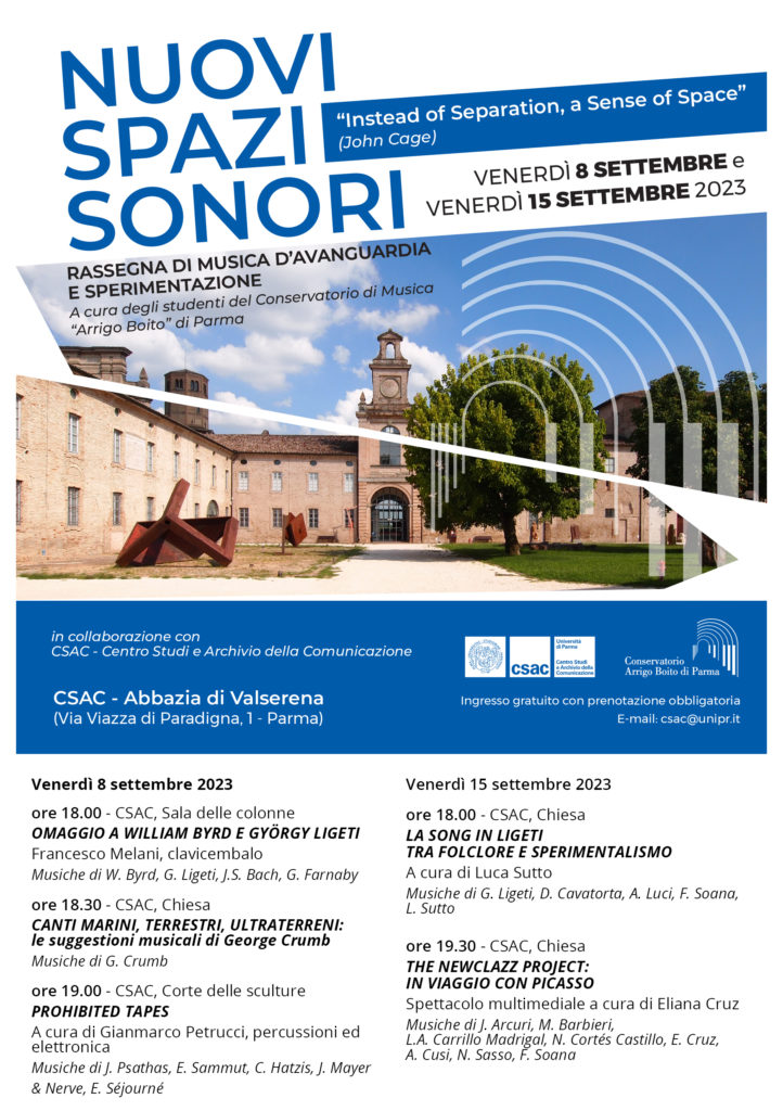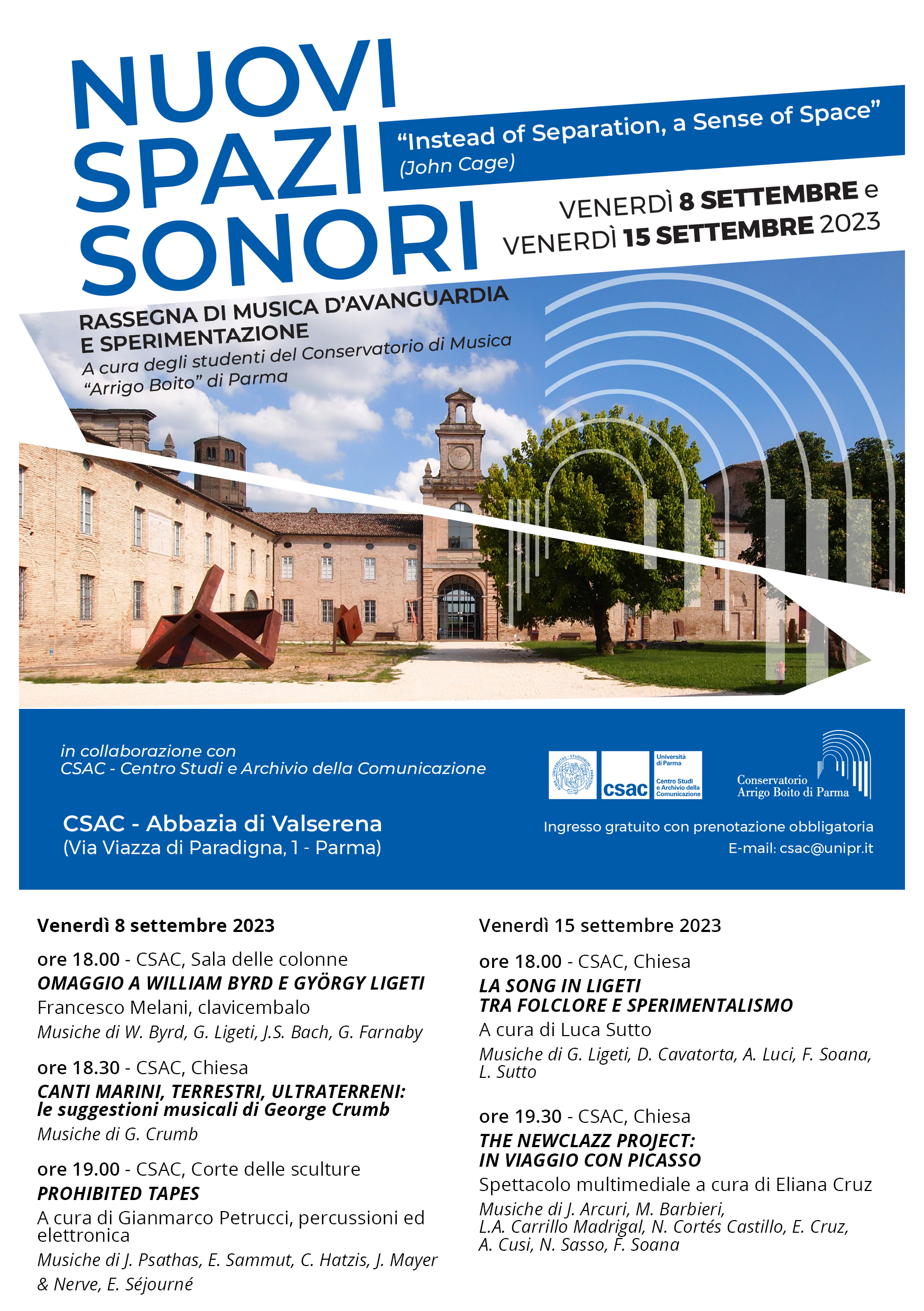 «Se andiamo in direzioni diverse otteniamo, anziché separazione, un senso dello spazio». Da questa osservazione di John Cage è tratto il sottotitolo della prima edizione della rassegna di musica d’avanguardia e sperimentazione «Nuovi spazi Sonori – Instead of Separation, a Sense of Space», a cura degli studenti del Conservatorio di Musica “Arrigo Boito” di Parma, realizzata in collaborazione con CSAC – Centro Studi e Archivio della Comunicazione e con il sostegno di Fondazione Cariparma. Due giorni di concerti, venerdì 8 settembre e venerdì 15 settembre 2023, che si terranno nei magnifici spazi offerti dall’Abbazia di Valserena, durante i quali i giovani talenti del Conservatorio esploreranno il rapporto tra musica antica e contemporanea, tra arte visiva e arte dei suoni, tra performance dal vivo e musica registrata, interpretando e reinterpretando grandi autori del Novecento e del passato, e proponendo composizioni scritte da loro stessi per l’occasione. Tutti gli appuntamenti sono a ingresso gratuito con prenotazione obbligatoria.