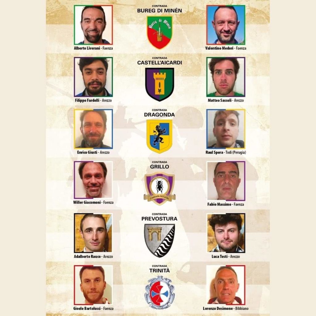 Novità in casa Bureg di Minen, che presenta Alberto Liverani, non nuovo sulla piazza per aver partecipato al Palio degli esordienti del 2019 e Valentino Medori entrambi da Faenza; Castell’Aicardi riconferma Filippo Fardelli, sempre protagonista delle ultime edizioni, e Matteo Sassoli, entrambi da Arezzo; la contrada Dragonda si affida nuovamente a Enrico Giusti da Arezzo affiancato da Raul Spera da Todi (Perugia); confermatissima in casa Grillo la coppia Willer Giacomoni, vincitore della scorsa edizione, e Fabio Massimo da Faenza; inedita accoppiata per la Prevostura che propone Adalberto Rauco, già conosciuto sulla piazza e il giovane Luca Testi entrambi da Arezzo; ancora conferme per la Trinità che si affida nuovamente a Gioele Bartolucci da Faenza e a Lorenzo Desimone da Bibbiano (Reggio Emilia).