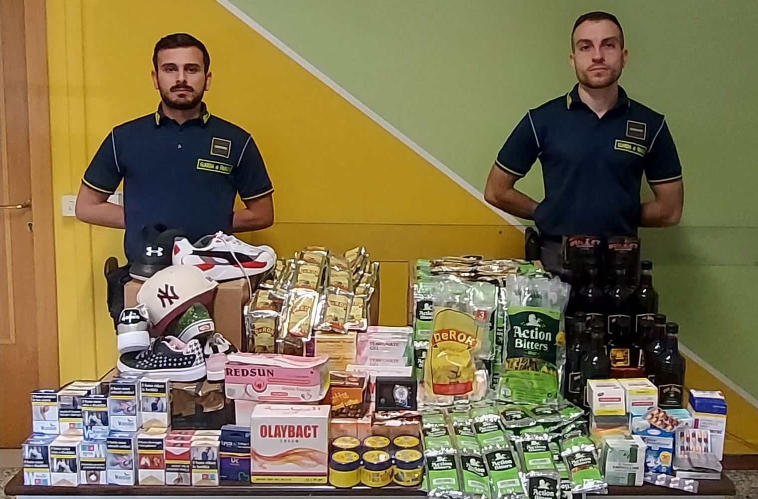 All’interno, i finanzieri hanno rinvenuto decine di pacchetti di sigarette detenuti per la vendita in assenza della necessaria licenza statale, bottiglie e shottini in mini brick contenenti superalcolici di contrabbando (tra cui rhum, whisky e vodka) per un totale di circa 90 litri, farmaci antibiotici, cortisonici e di automedicazione di provenienza estera, venduti senza la dovuta autorizzazione ed in alcuni casi anche scaduti, nonché alcuni capi d’abbigliamento sportivo – scarpe e cappellini – e un orologio di un noto marchio contraffatti.